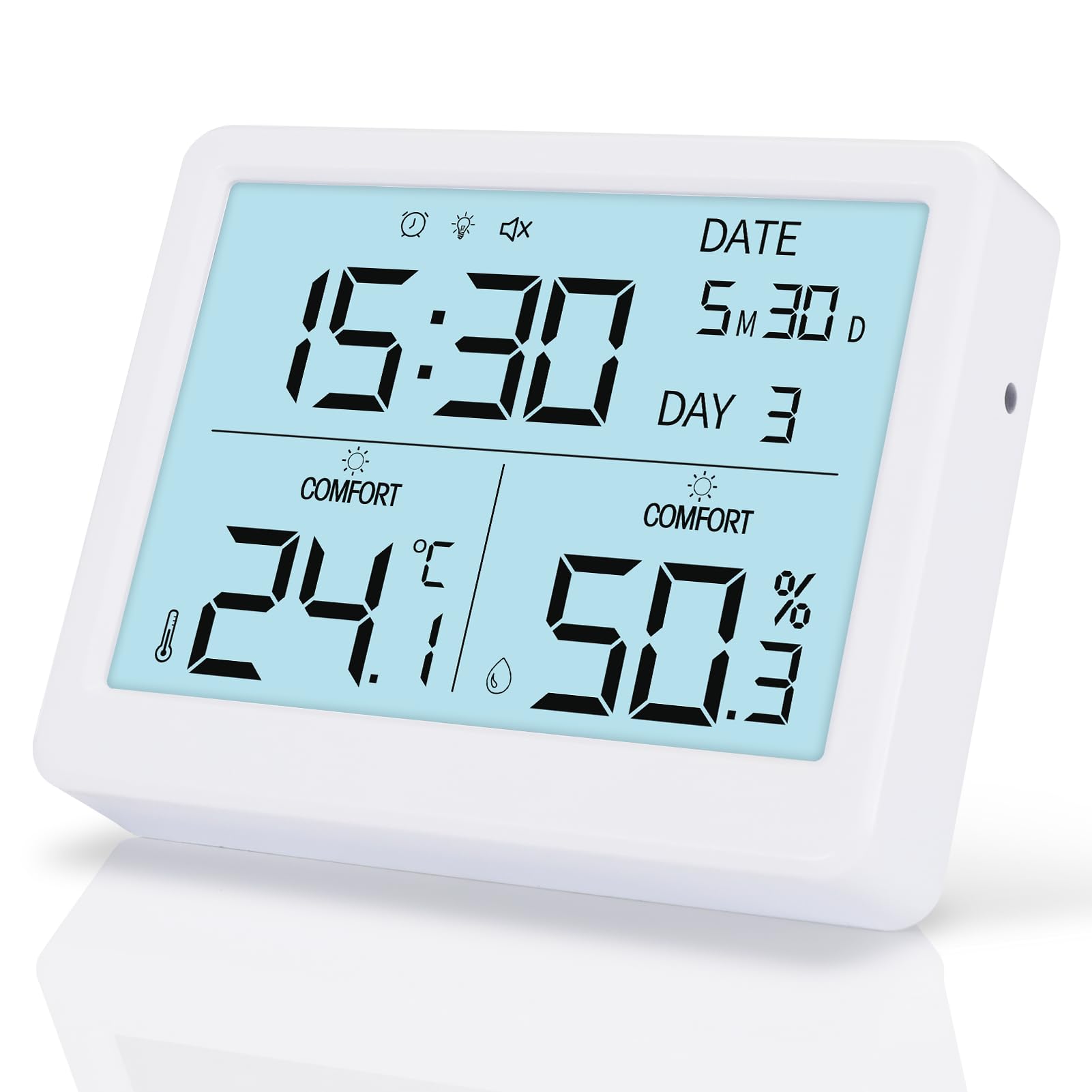 Termómetro digital para interiores y medidor de humedad, medidor de temperatura higrómetro para el hogar con fecha, reloj, brillo
