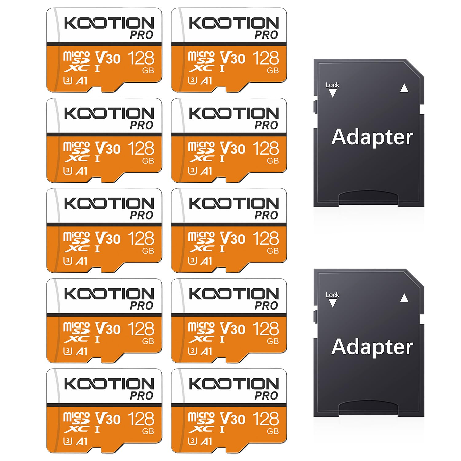 KOOTION Paquete de 10 tarjetas Micro SD de 128 GB con adaptador, tarjeta de memoria flash TF de alta velocidad U3, A1, V30, 4K UHD