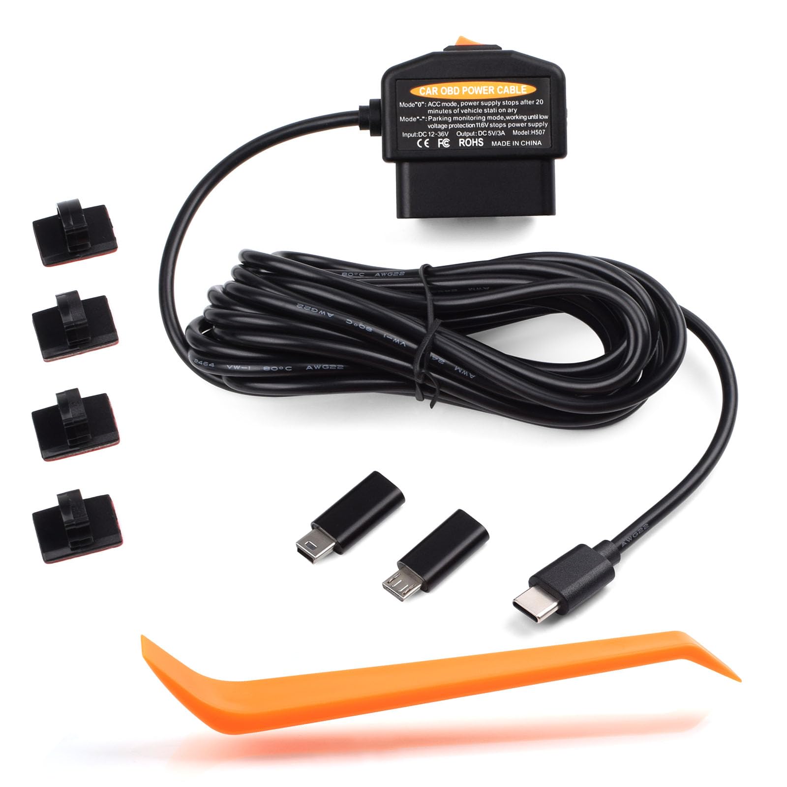 Cable de alimentación OBD2 para cámara de tablero OBD a Tipo-C, adaptador OBD USB OBD, cable de carga de cable duro, 24 horas de v