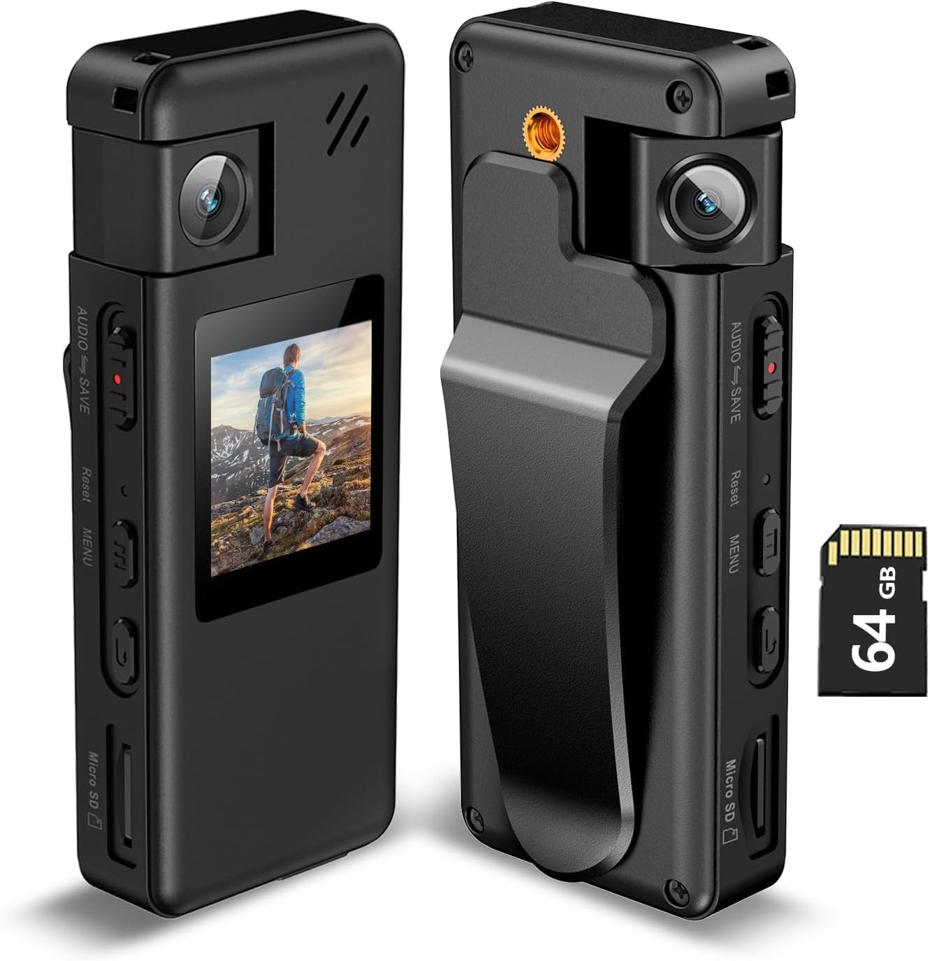 Videocámara de bolsillo de 128 GB, cámaras corporales con grabación de audio y video. Lente giratoria de 180° True HD 1080P 1.4 pu