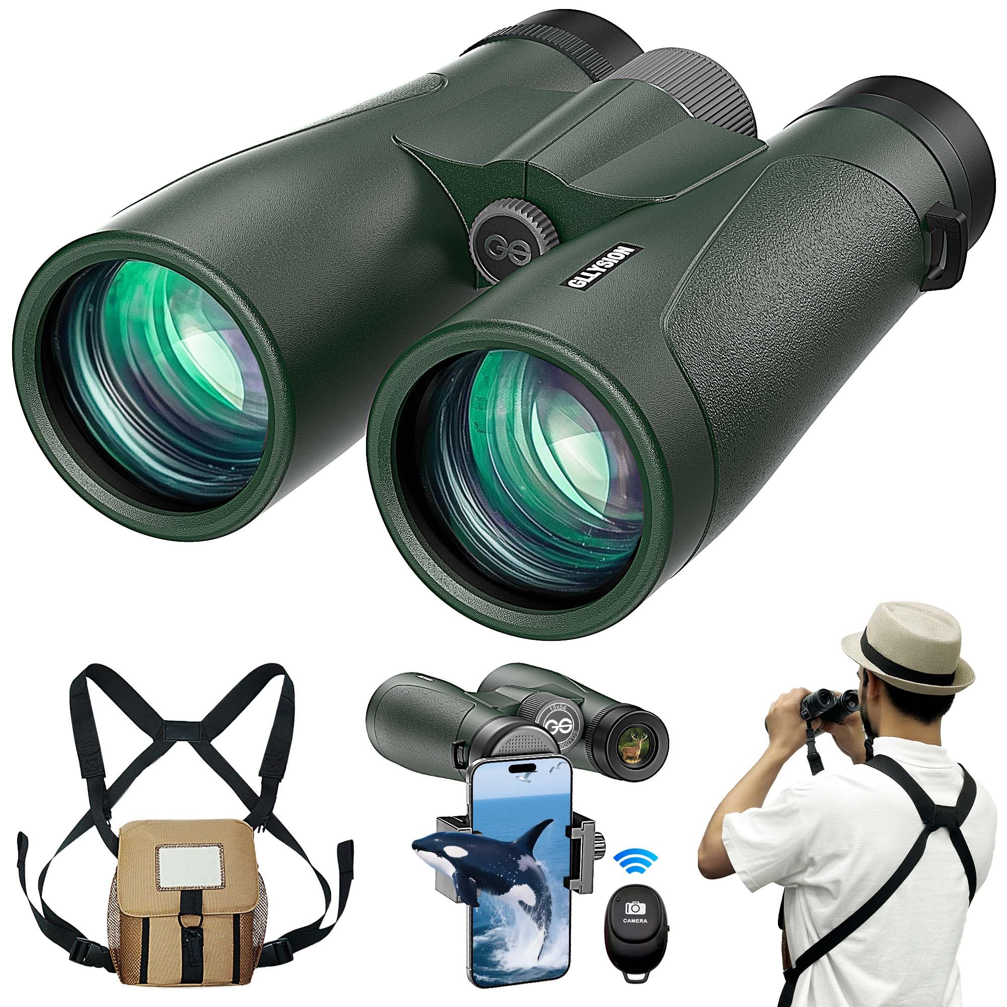 Prismáticos de 15 x 54 para adultos de alta potencia con arnés, adaptador de teléfono y control remoto de cámara Bluetooth, binocu