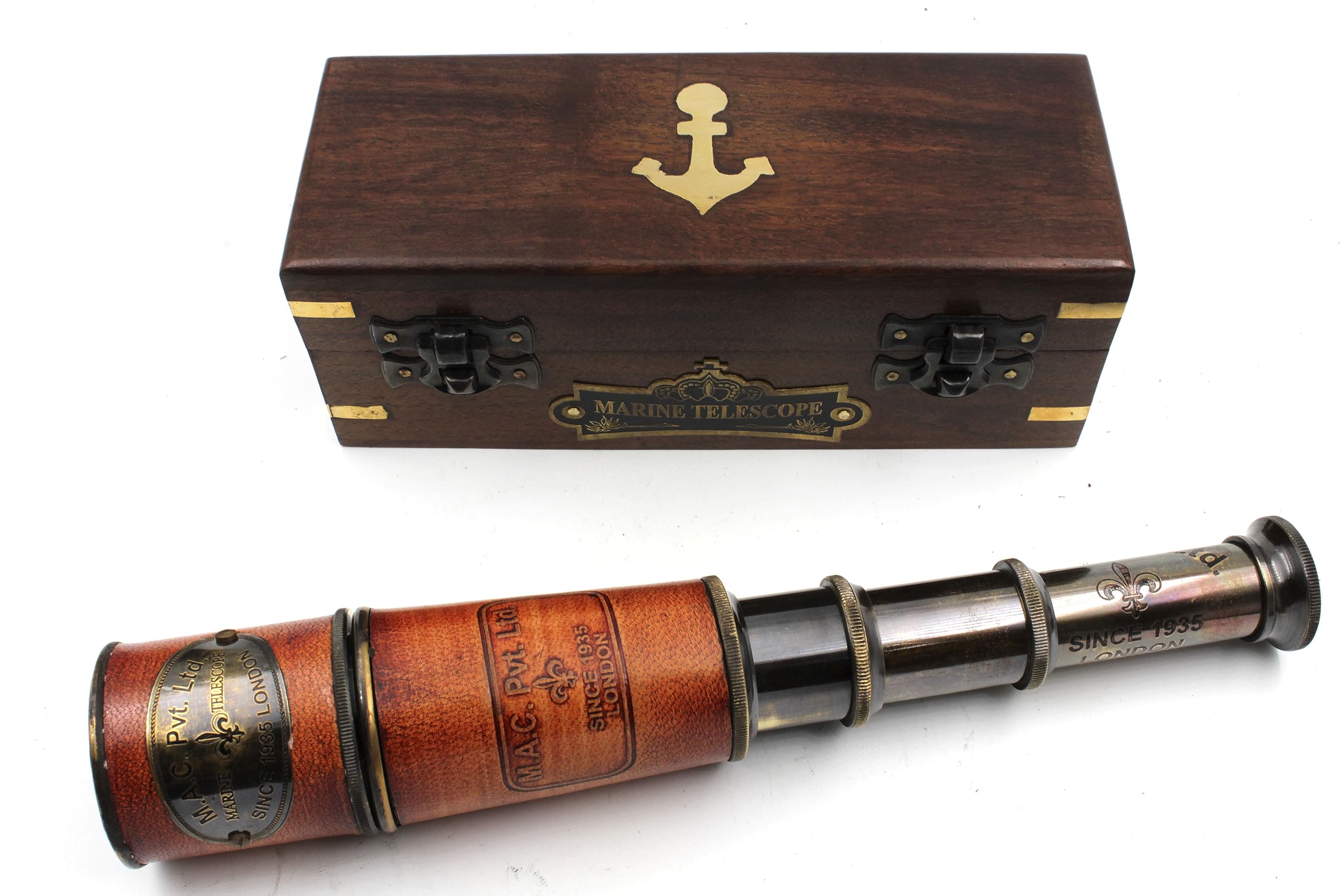 Telescopio M.A.C. hecho a mano, con caja de madera, réplica vintage funcional, telescopio náutico antiguo de latón, cristal espía