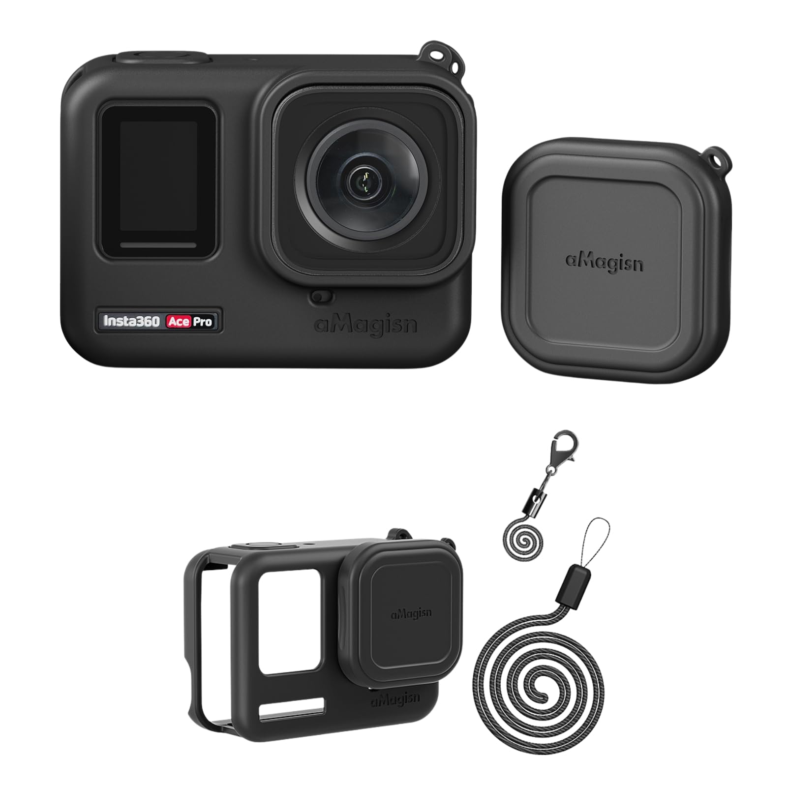 Funda de silicona para Insta360 Ace Pro, a prueba de golpes, con correa antipérdida y cordón, color negro