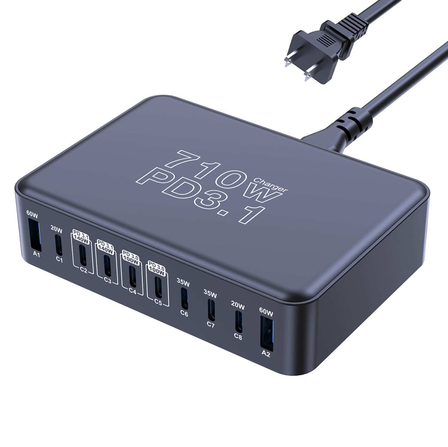 CHIPOFY Bloque de cargador USB C de 710 W, estación de carga USB C de 10 puertos, doble PD3.1 140W QC3.0 60W GaN cargador de pared