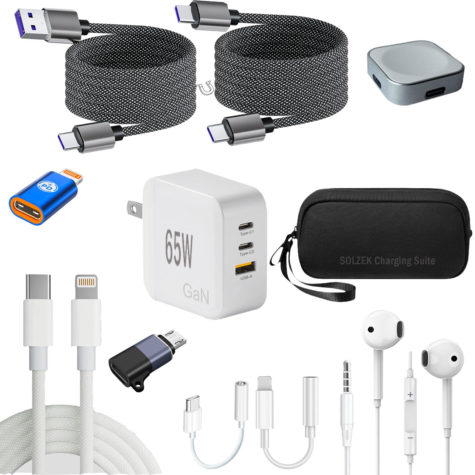 Suite de carga todo en uno para viajes, 11 artículos incluidos, cubre USB C/Lightning/Micro USB/iWatch, con auriculares para 3 pue