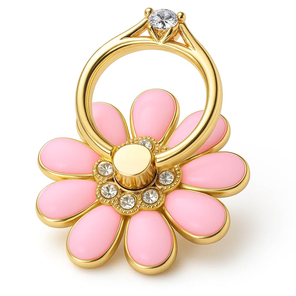 NXVX Soporte para anillo de teléfono de flores de nueve pétalos, bonito soporte de dedo rosa brillante de 360° con diamantes de im