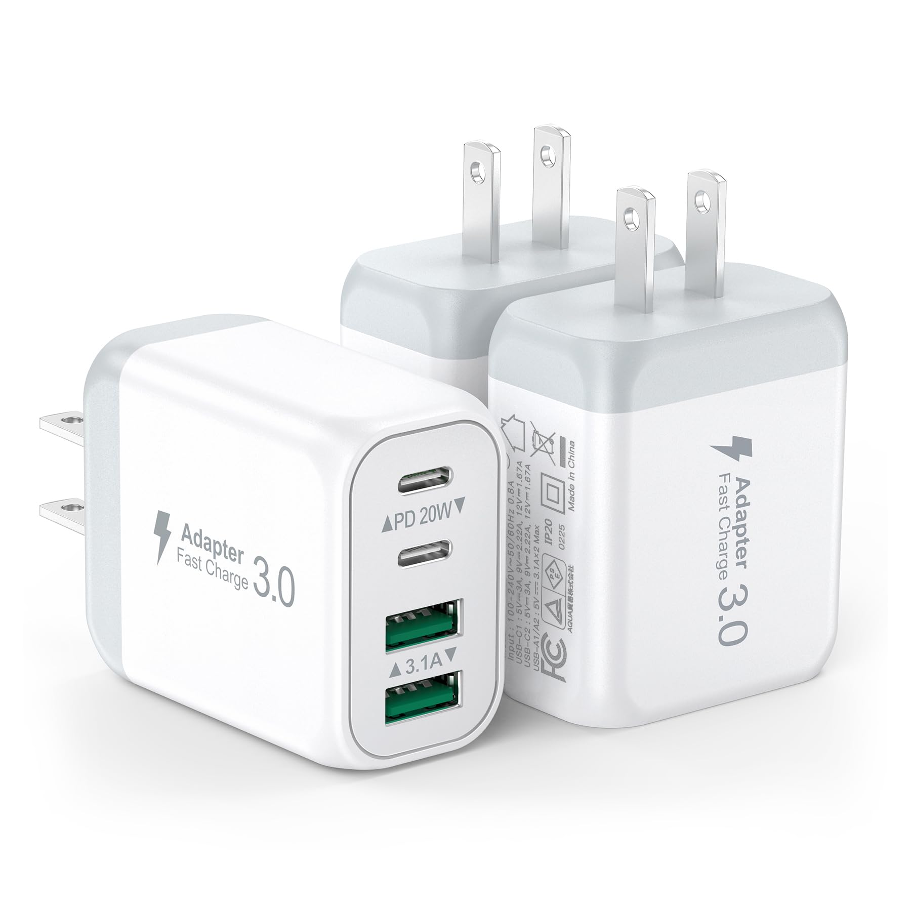 Paquete de 3 cargadores USB de pared, bloque de cargador USB C rápido de 4 puertos, adaptador de corriente PD, enchufe de pared QC