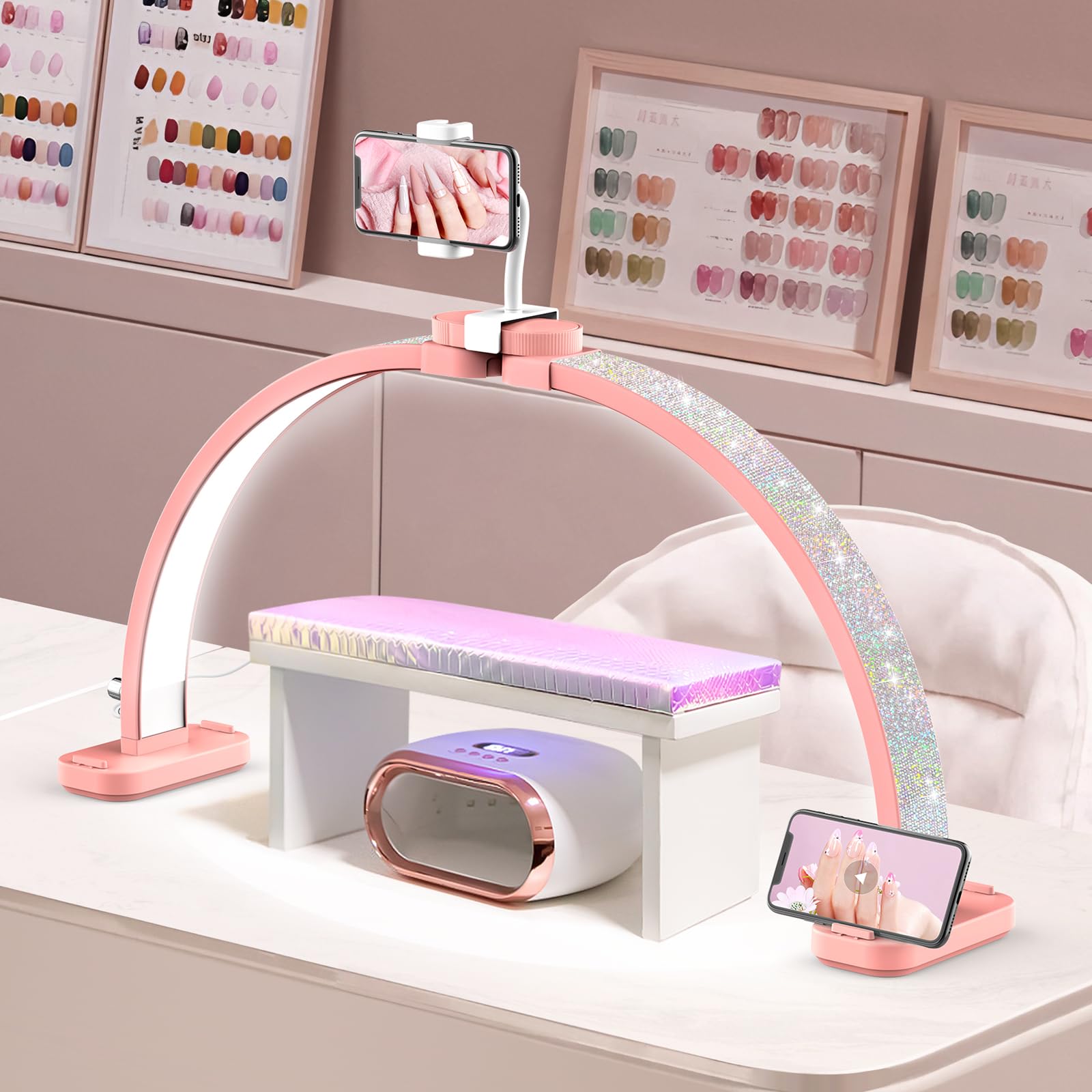 Luz de media luna para tecnología de uñas: Lámpara LED de pestañas de 31 pulgadas con soporte para teléfono – Luces de arco plegab