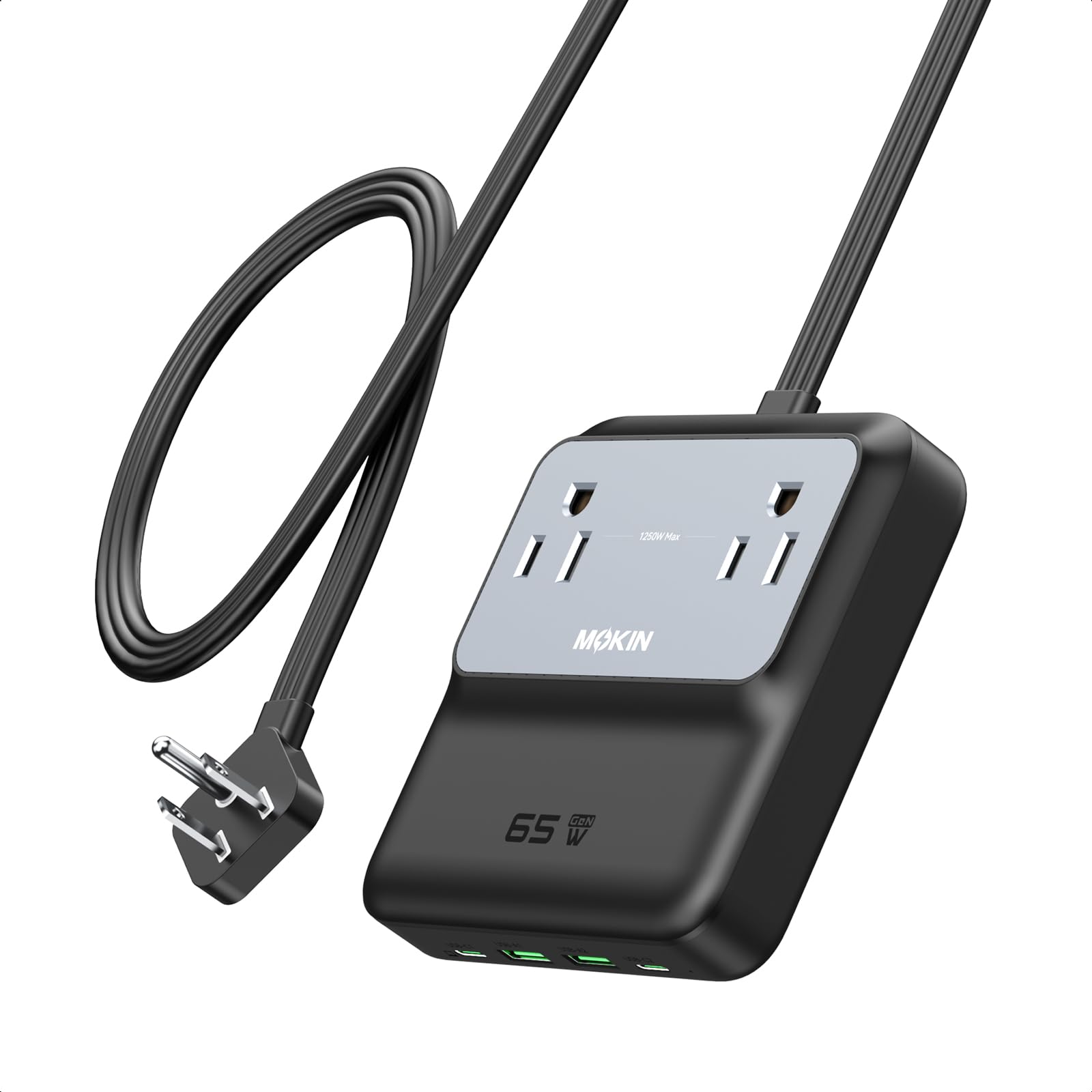 Estación de carga, tira de alimentación USB C 6 en 1 de 65 W máximo para iPhone 16/15 y MacBook, enchufe plano y cable de extensió