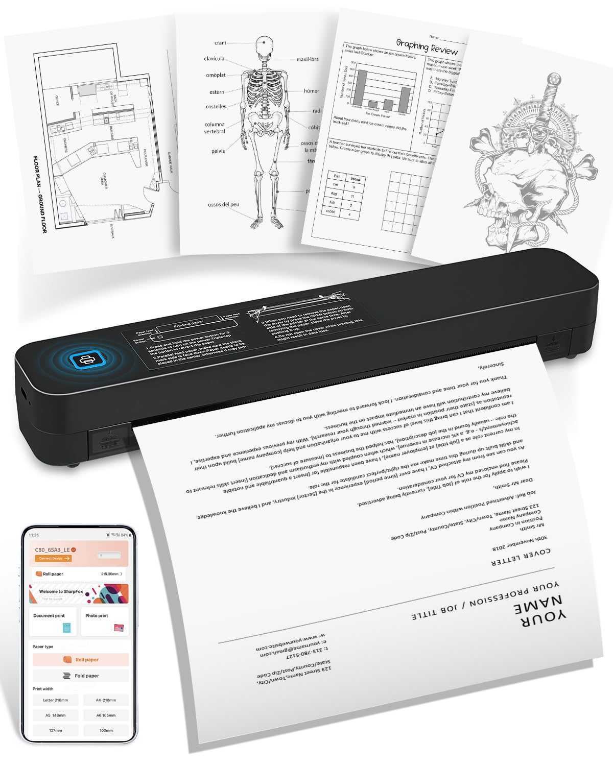 Impresora térmica portátil inalámbrica para viajes, impresora sin tinta compatible con 8.5 x 11 pulgadas, letra A4/EE. UU., compat