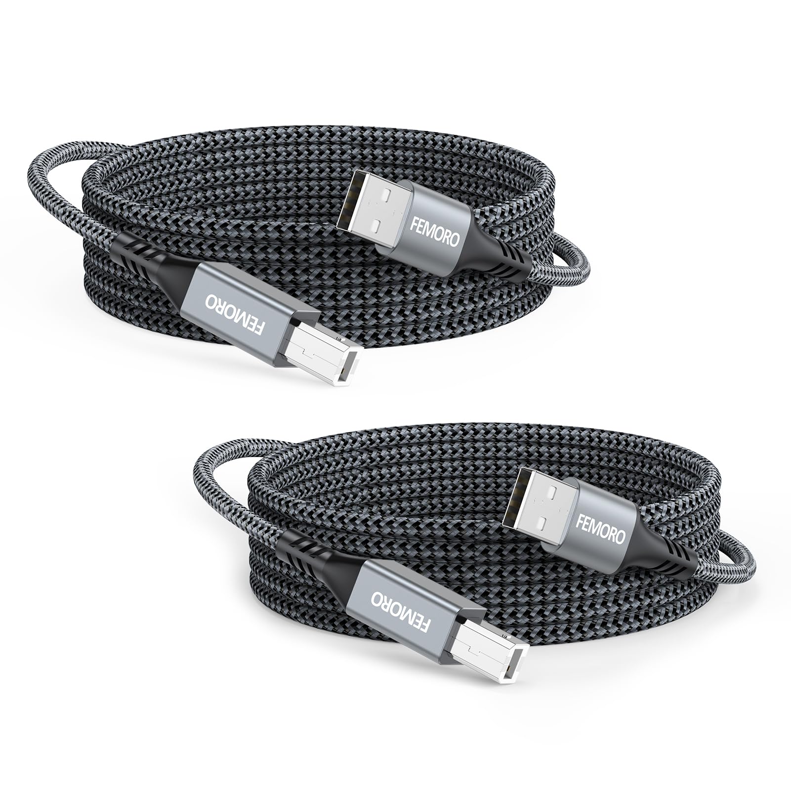 FEMORO Paquete de 2 cables de impresora USB de 10 pies, USB A a tipo B 2.0, trenzado de alta velocidad, transferencia de datos 2.0