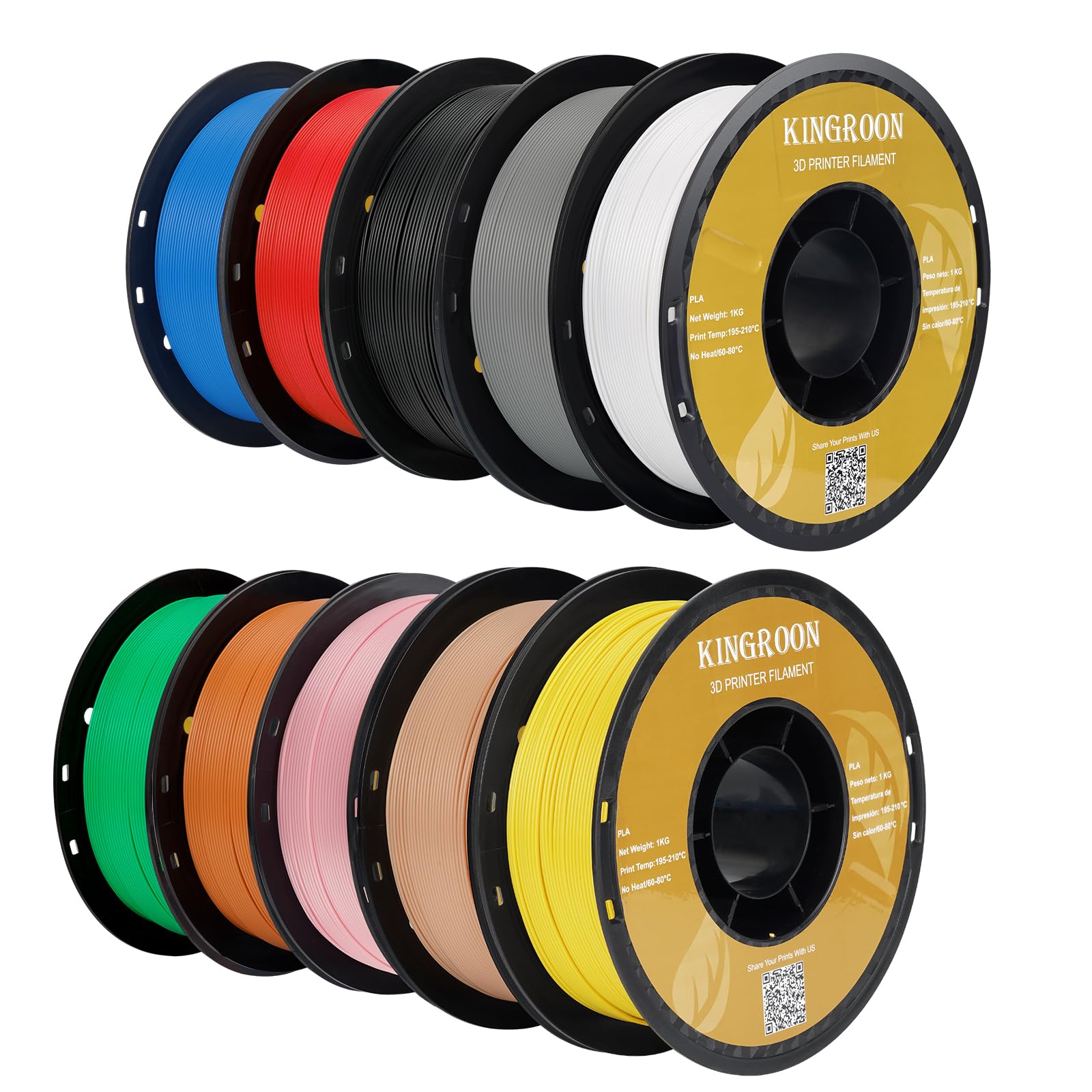 Kingroon Filamento PLA para impresora 3D, 10 rollos, precisión dimensional +/- 0.001 in, carrete de 22 libras (22 libras), 0.069 i