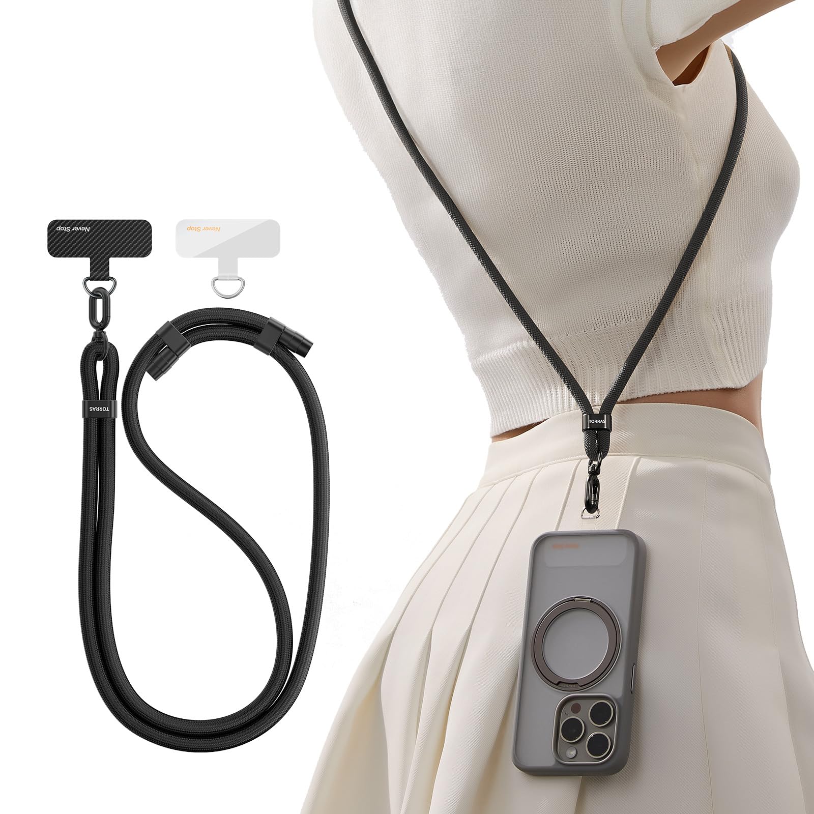 TORRAS Correa cruzada para teléfono con 2 pestañas para teléfono, correa ajustable antirrobo para todos los teléfonos, hebillas de