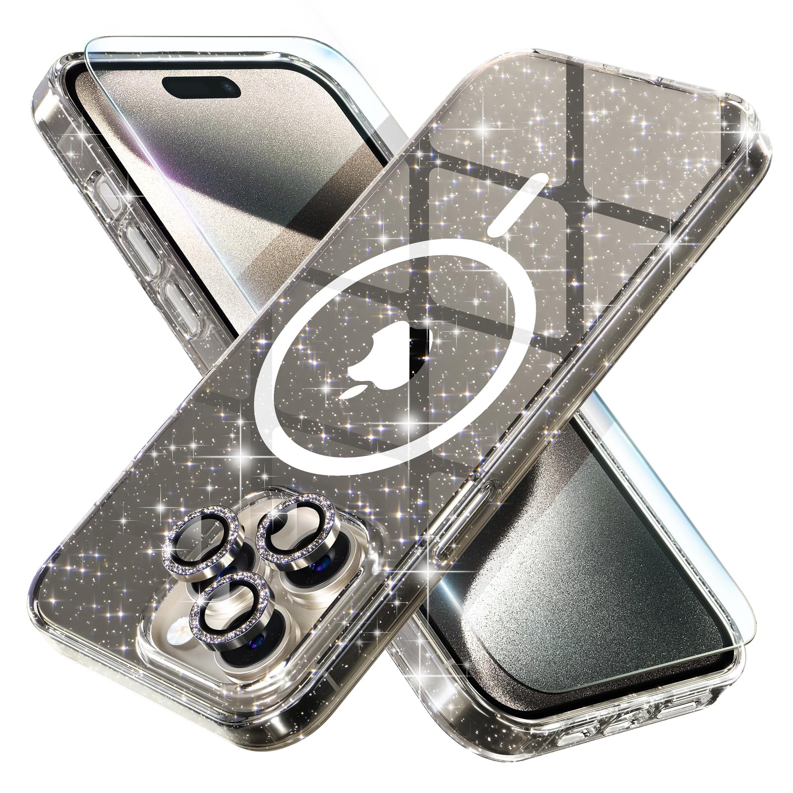 Choiche Funda magnética para iPhone 15 Pro Max, funda transparente con purpurina brillante para mujer, [3 protectores de lente de