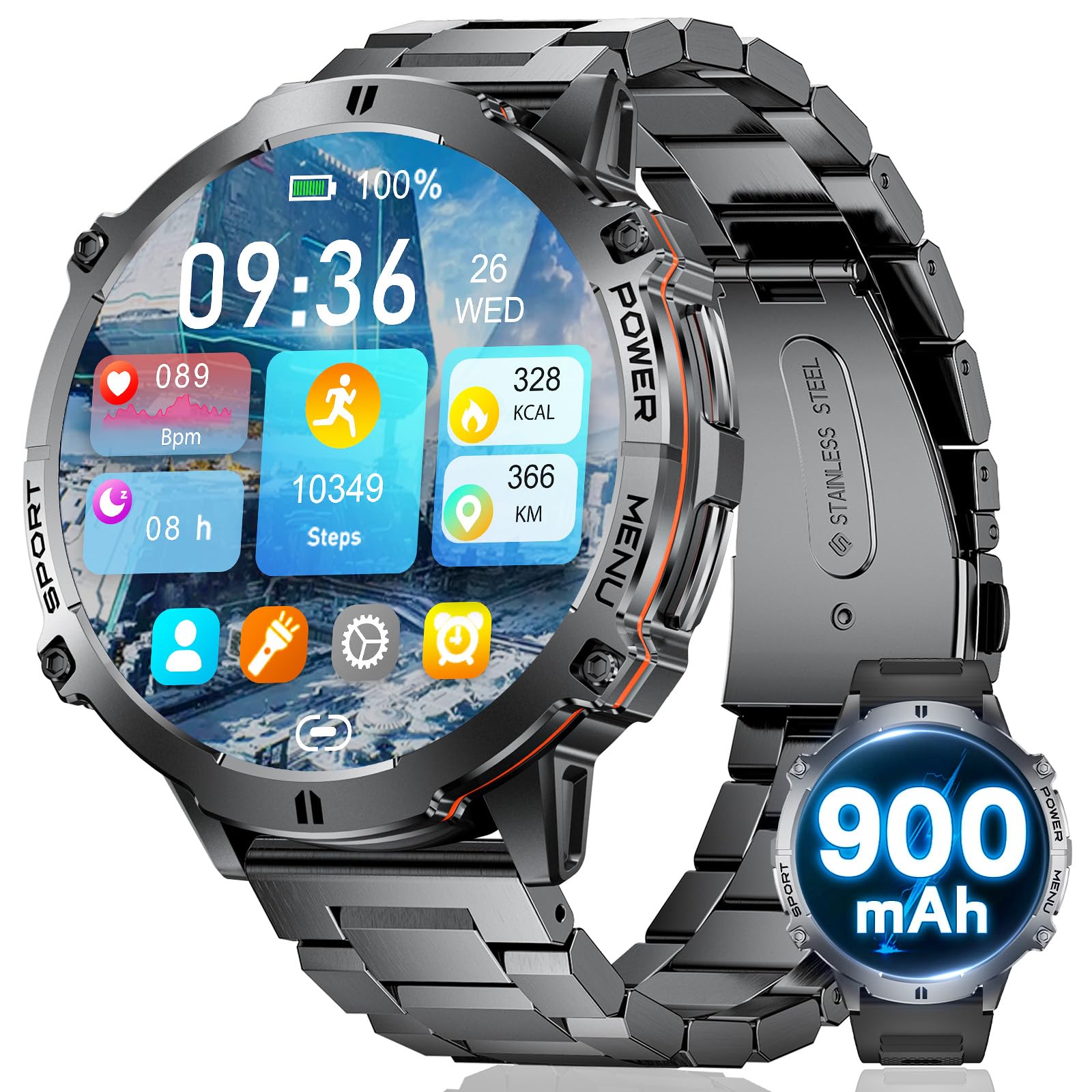 LIGE Reloj inteligente militar con batería de 900 mAh (60 + modo de espera), AMOLED de 1.73 pulgadas con altitud de brújula y pres