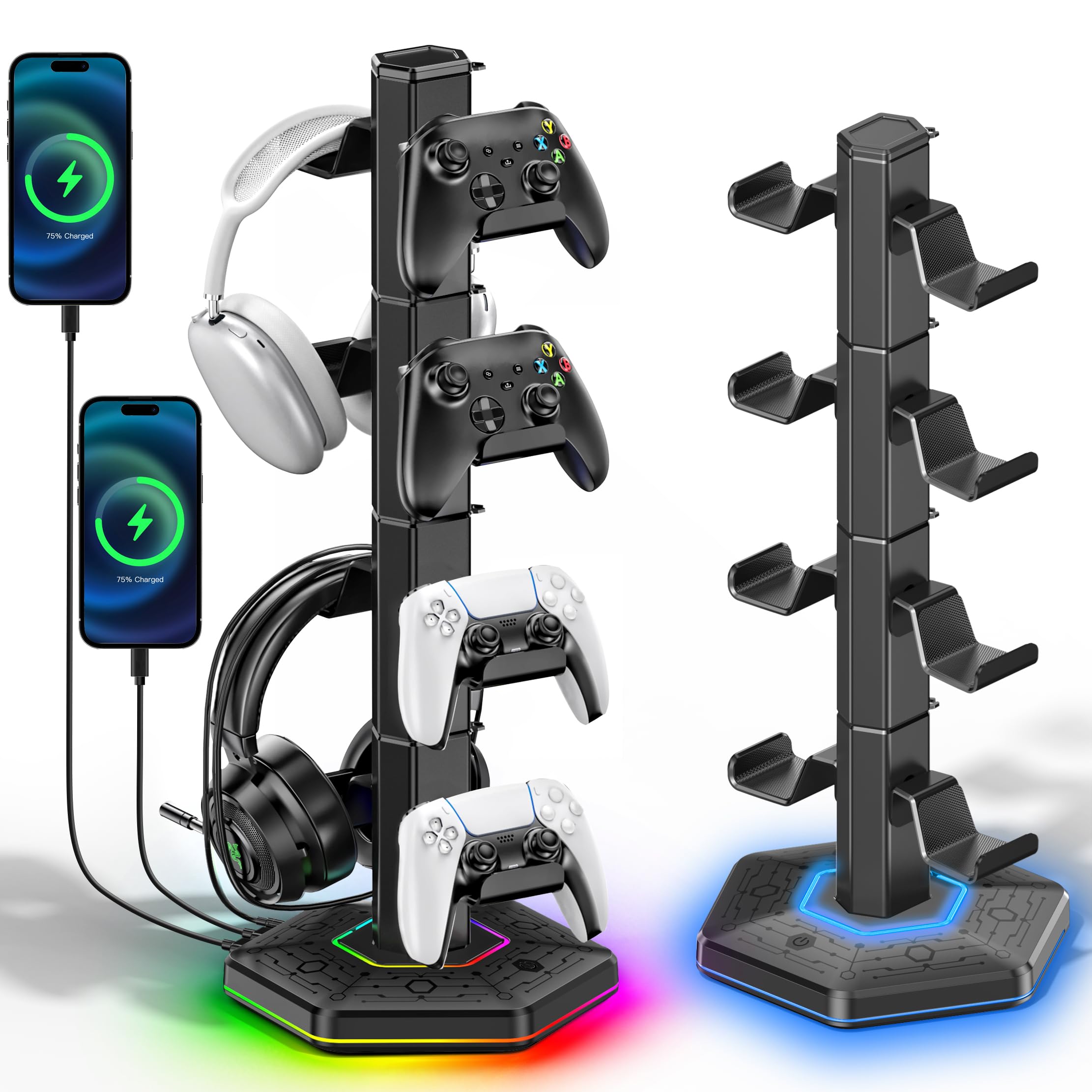 Soporte de controlador RGB para PS5/PS4/Xbox/Switch, soporte para auriculares con 2 puertos de carga USB y tipo C, soporte para au
