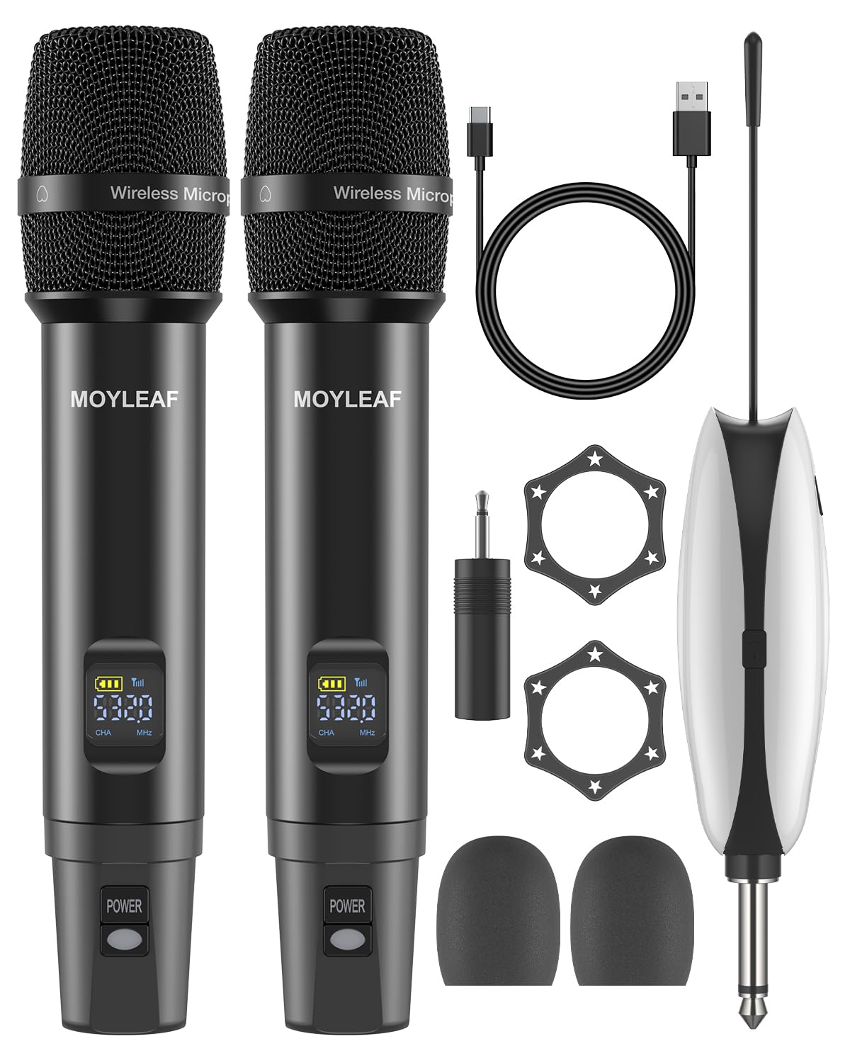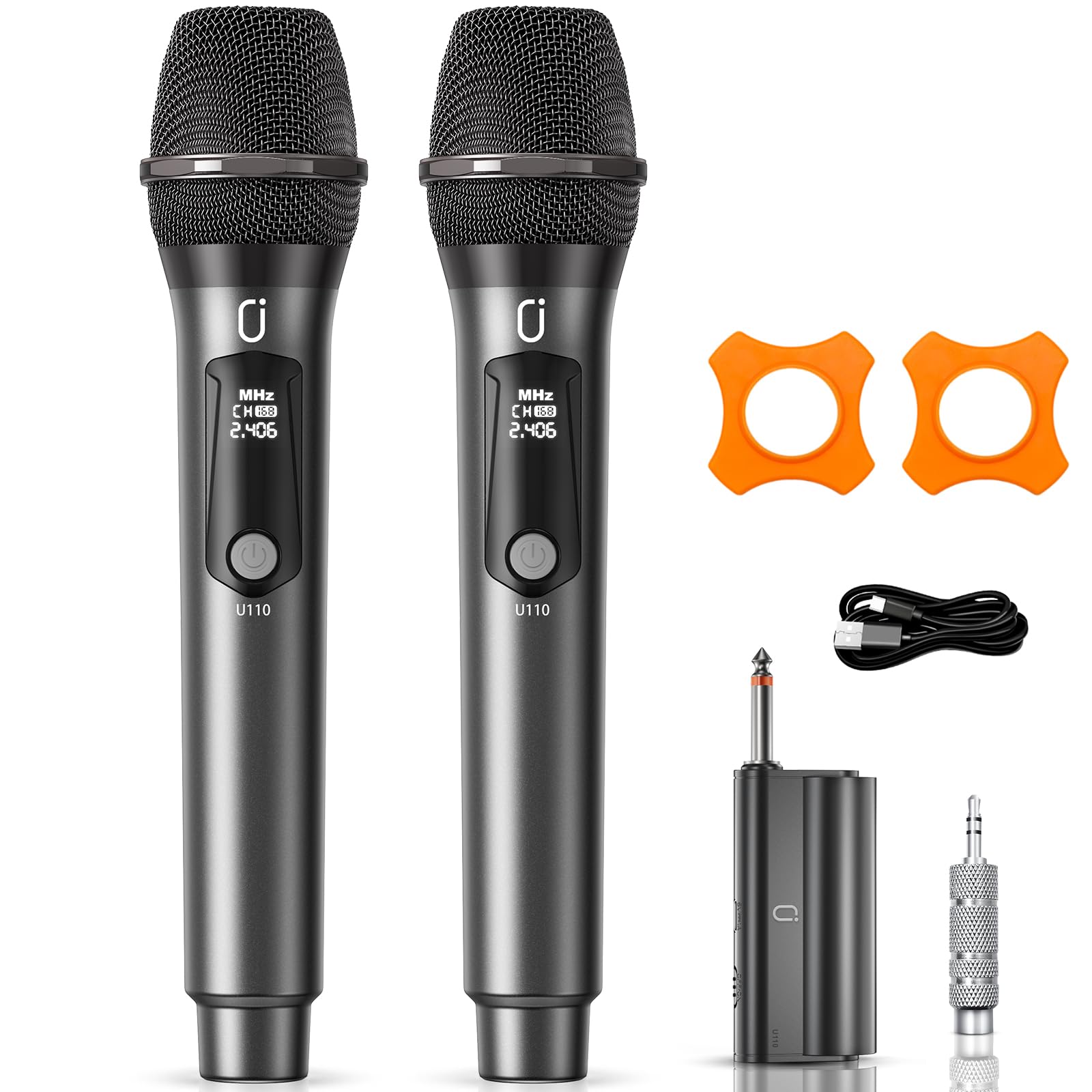 Micrófonos inalámbricos, micrófono de metal con doble sistema dinámico inalámbrico profesional UHF, receptor de micrófono recargab