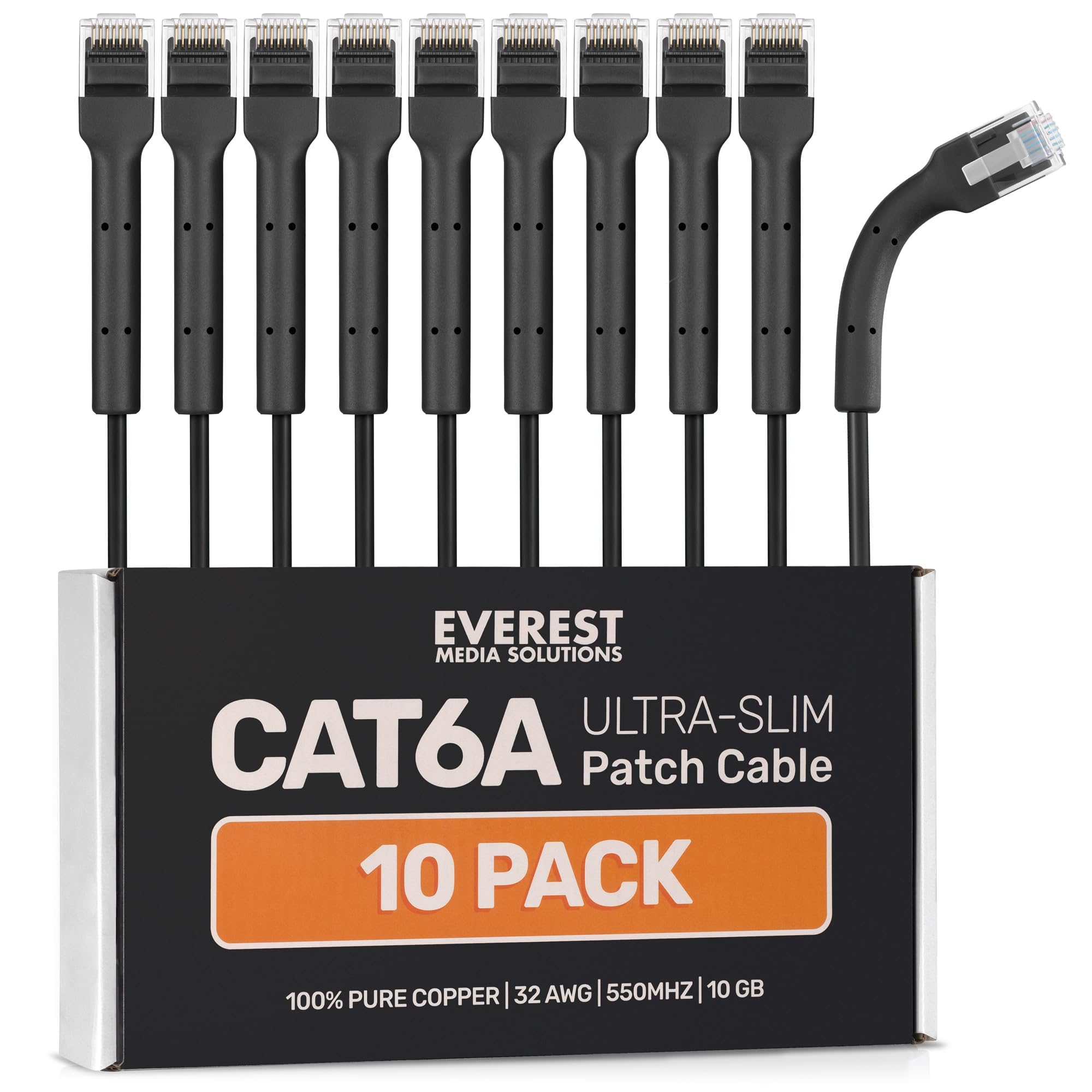 Everest – Cables de conexión Ethernet Cat6a Ultra Slim de 1 pie (paquete de 10 unidades), color negro, cable de conexión Cat 6a de