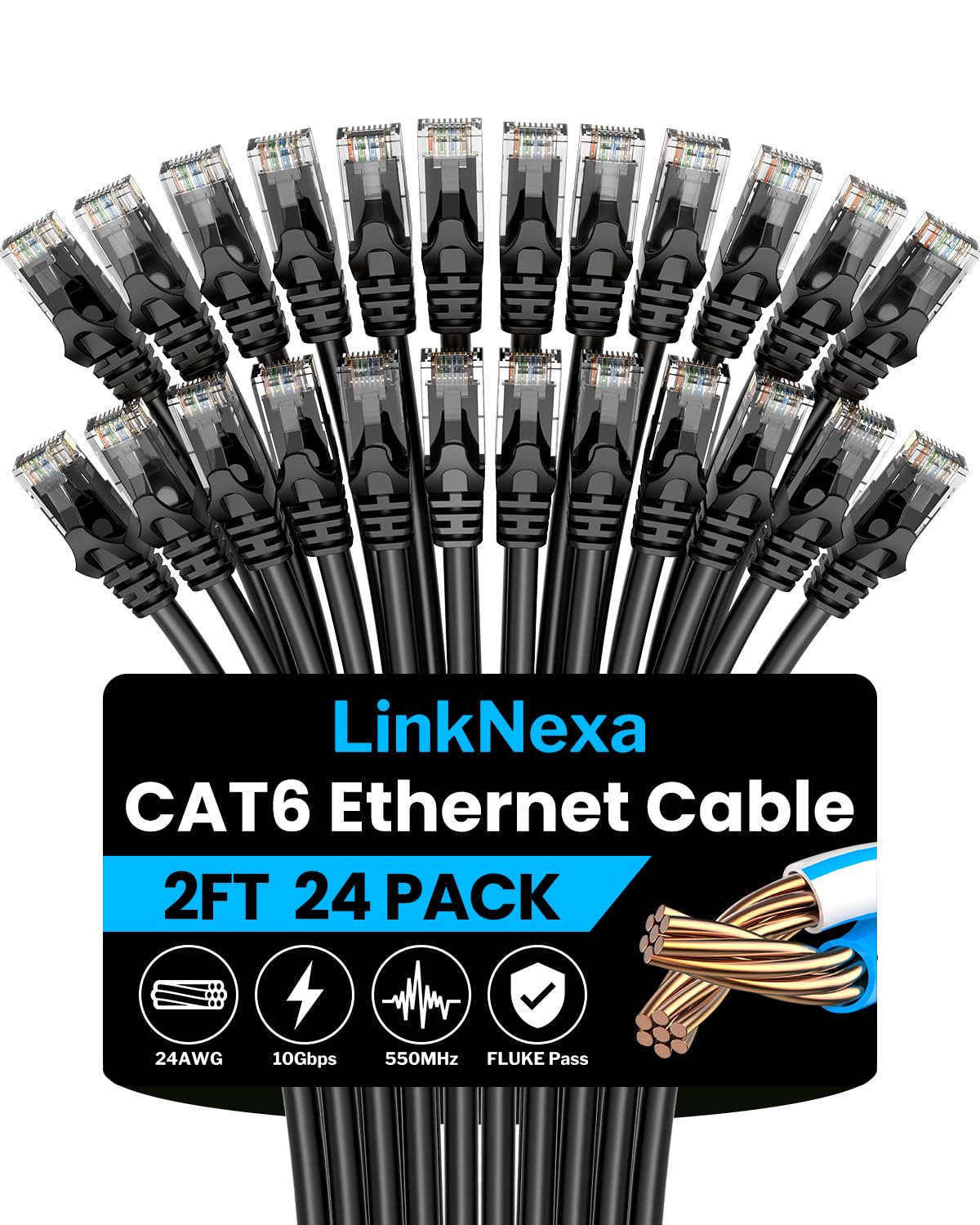 Cable Ethernet Cat 6 de 2 pies (paquete de 24), cable de red de alta velocidad de 10 Gbps, UTP 24AWG flexible RJ45 LAN para comput