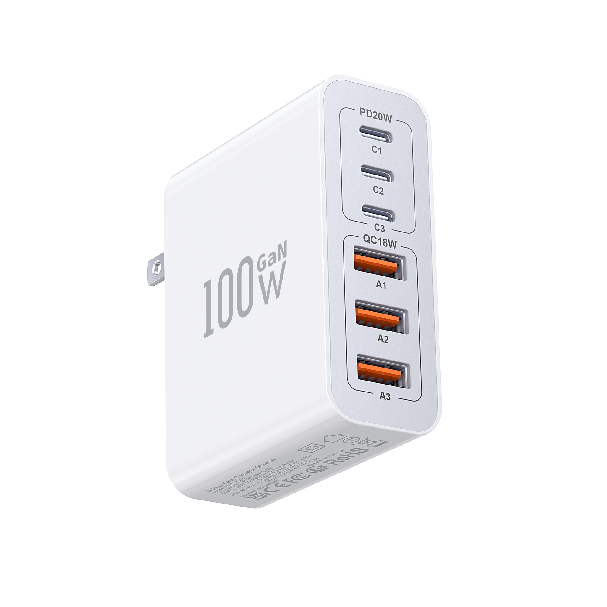 Bloque de cargador de pared USB C, 100W GaN 6 puertos QC+PD3.0 estación de carga tipo C cargadores rápidos enchufe de ladrillo cub