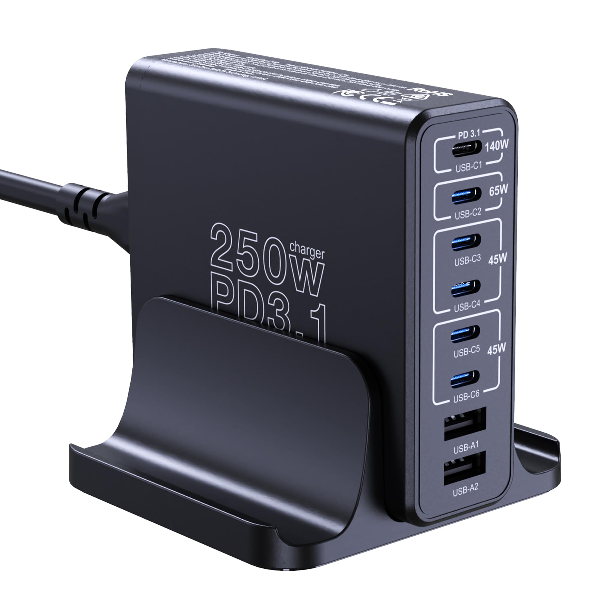 Aftertop Cargador USB C de 250 W, estación de carga rápida PD3.1 de 8 puertos de 140 W, cargador compacto GaN para computadora por