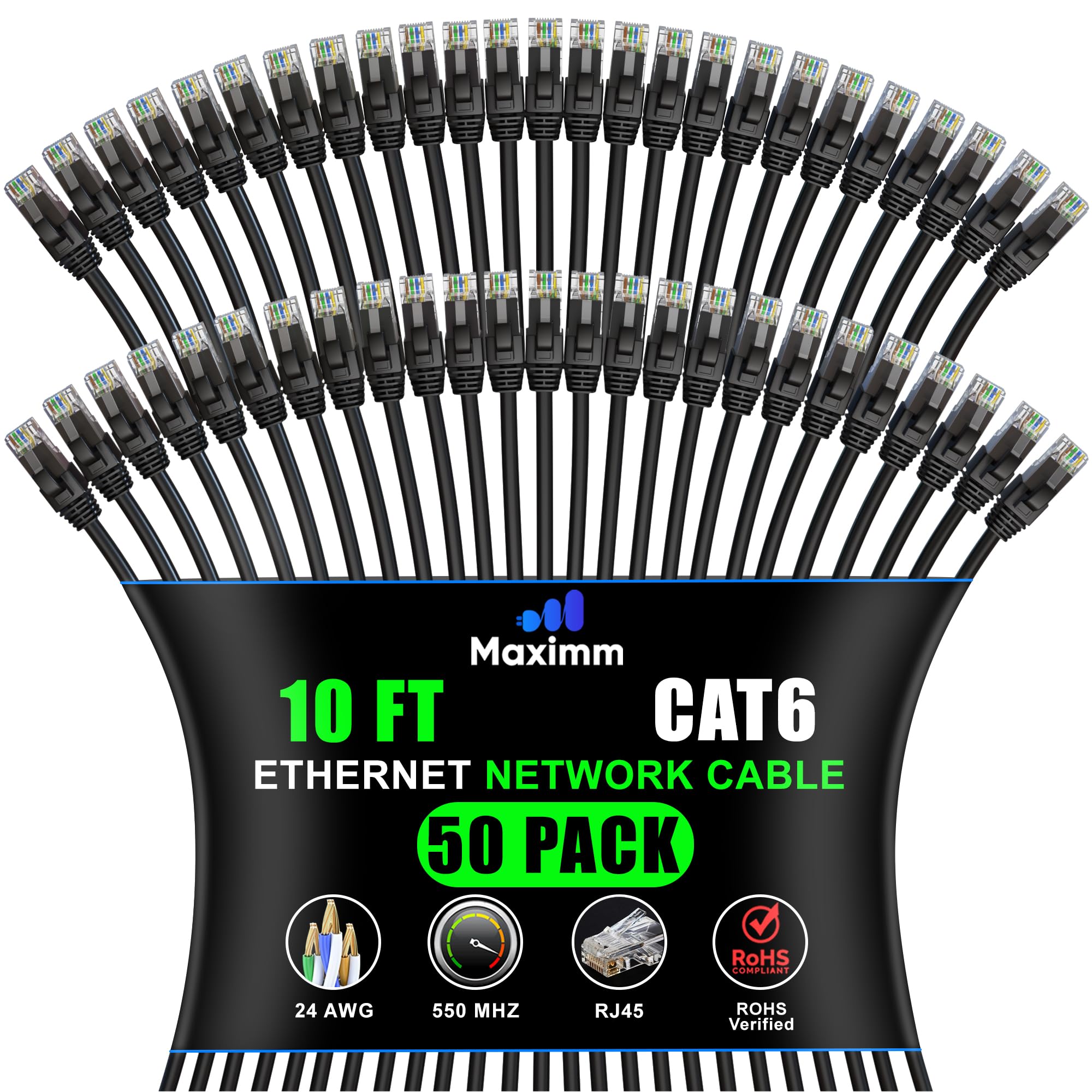 Maximm Cable Ethernet Cat 6 de 10 pies (paquete de 50) cable Cat6, cable LAN, cable de Internet, cable de conexión y cable de red,