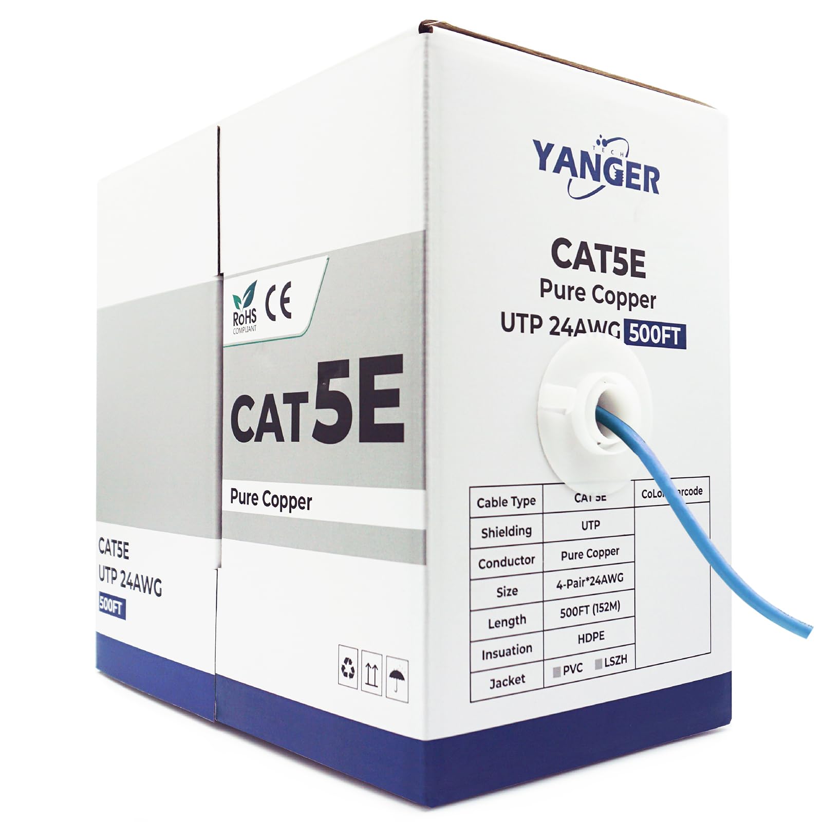 YANGER Cable Ethernet CAT5e de 500 pies – 24AWG 100% cobre puro, POE++, cable de red UTP, caja de extracción, para centros de dato