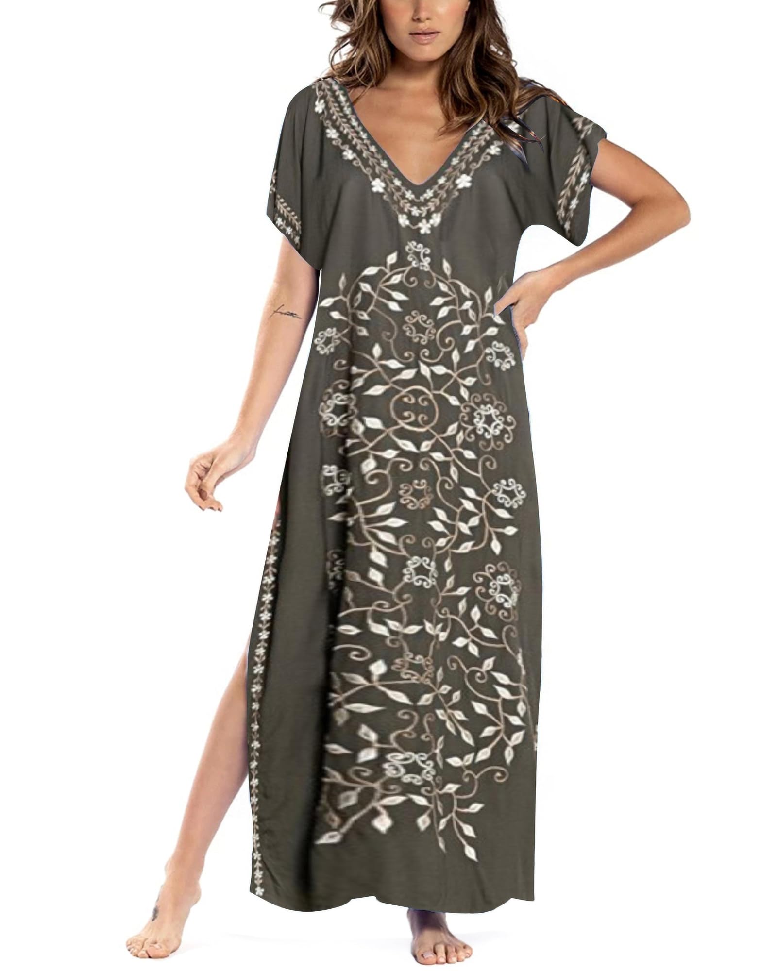 Busbseach – Vestidos de caftán para mujer, bordado de manga corta, para playa, cuello en V, maxi vestido caftán