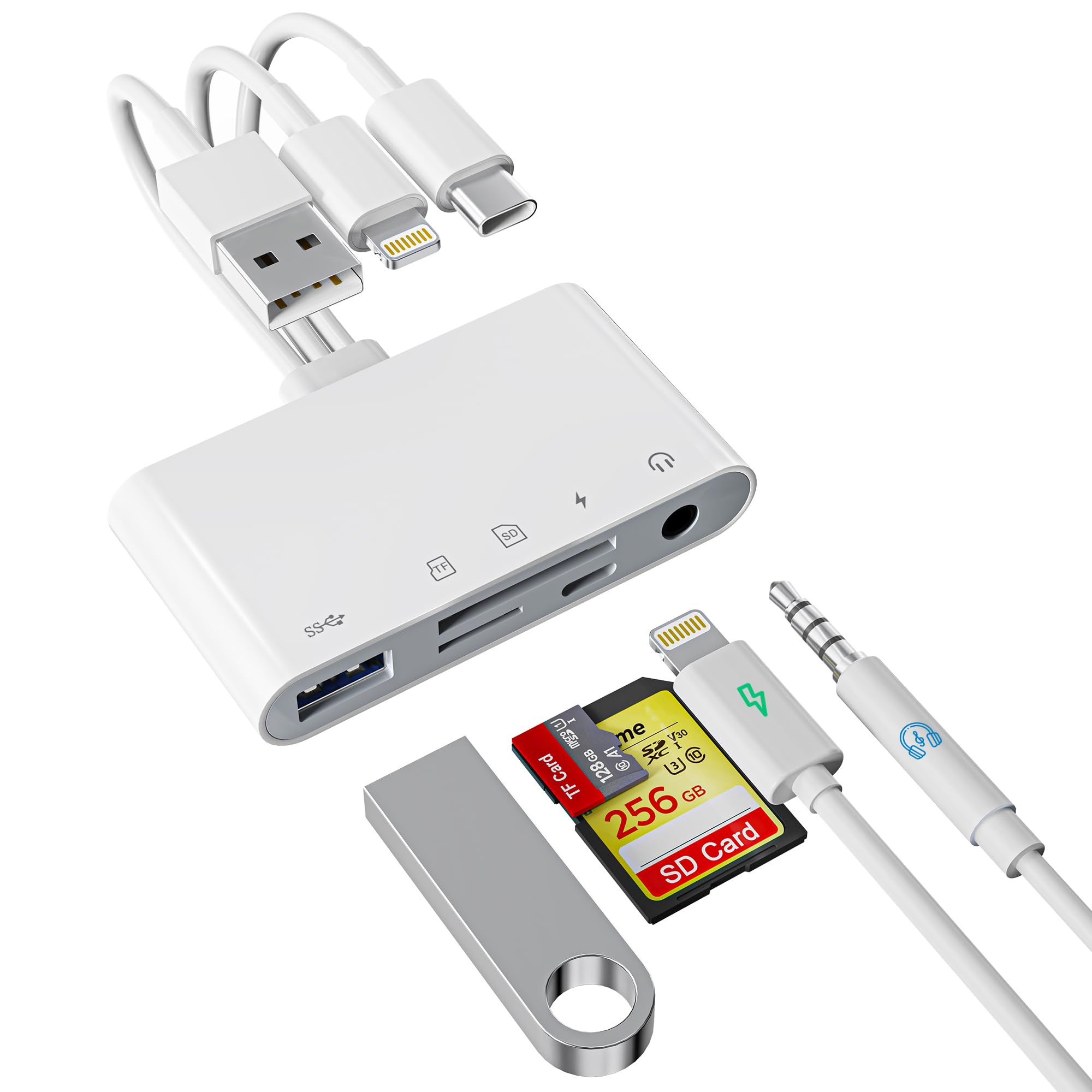 7 en 3 Lightning & USB-C y USB3.0 Lector de tarjetas múltiples, SD CF XD MS Micro SD TF lector de tarjetas para iPhone/iPad, lecto