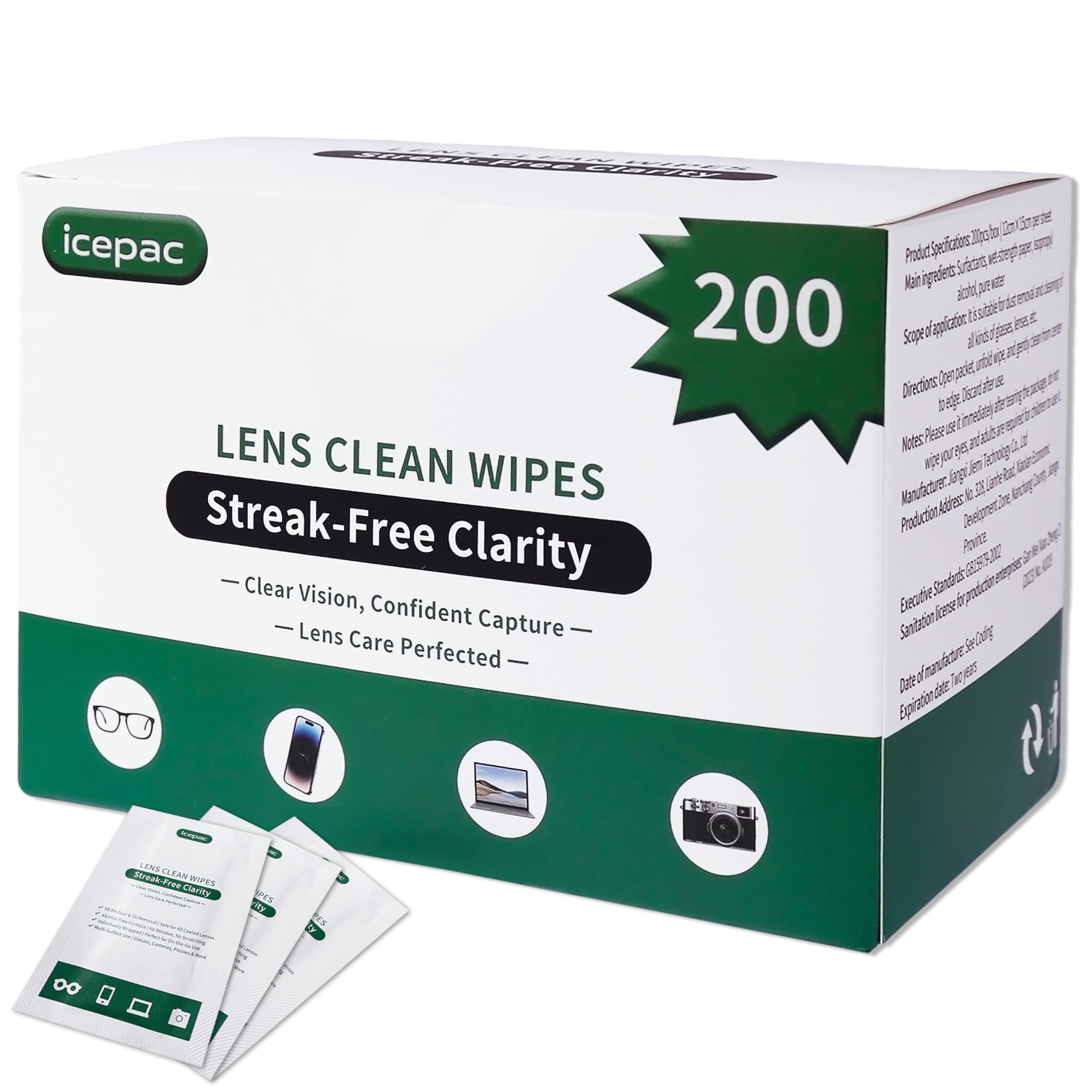 Icepac Toallitas para lentes – 200 toallitas de limpieza para gafas envueltas individuales humedecidas | 5 x 6 pulgadas – Limpiado