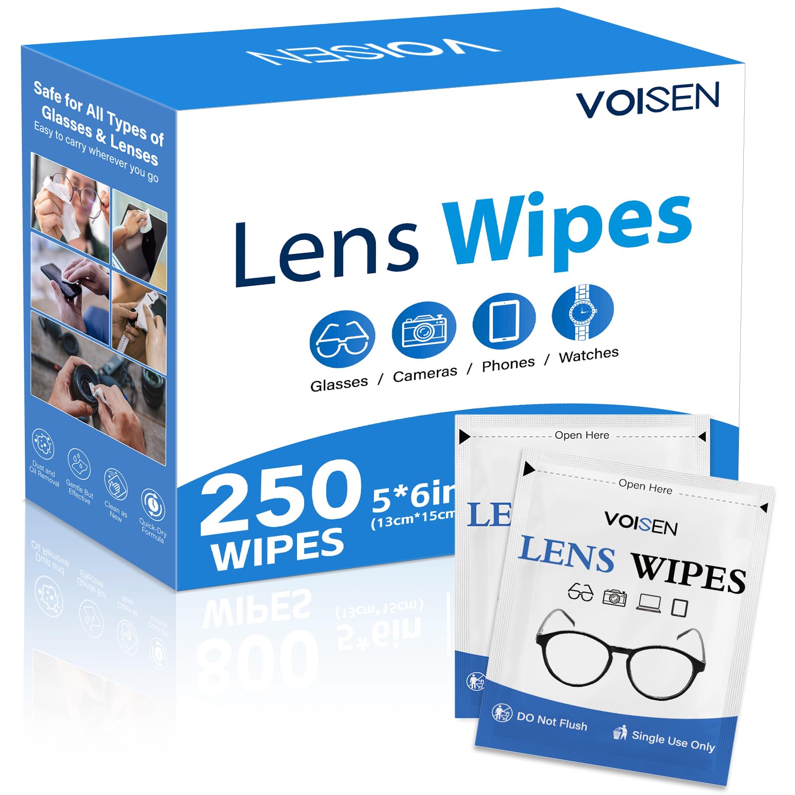 VOISEN Toallitas limpiadoras para lentes, paquete de 250 toallitas limpiadoras para lentes, prehumedecidas envueltas individualmen