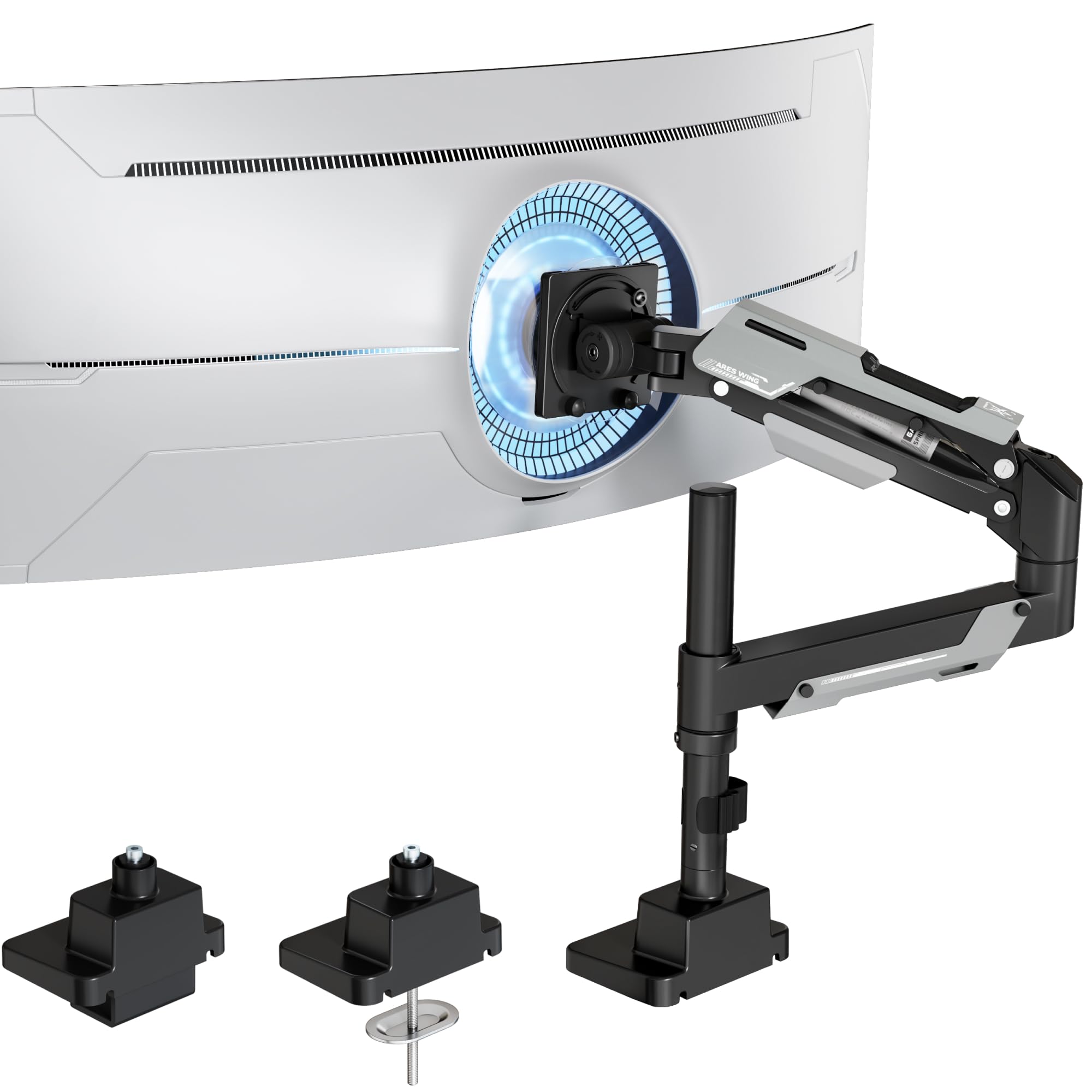 ARES WING Soporte para monitor único, brazo de monitor ultraancho para pantalla curva de alta resistencia de 24 a 57 pulgadas, mon