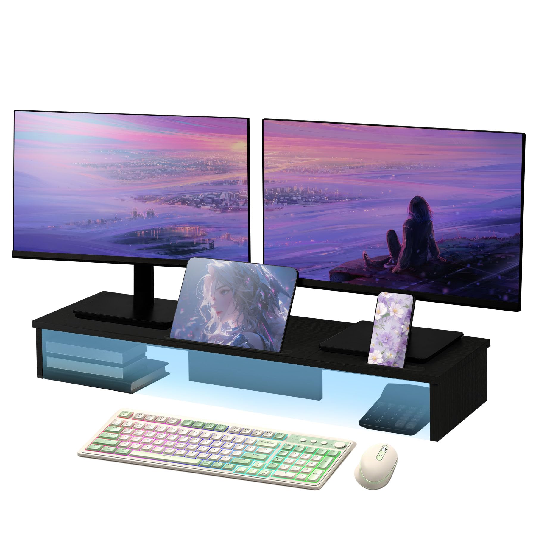 Soporte elevador de monitor doble con luces LED y soporte para tableta de teléfono, soporte de monitor grande de 35.8 pulgadas par