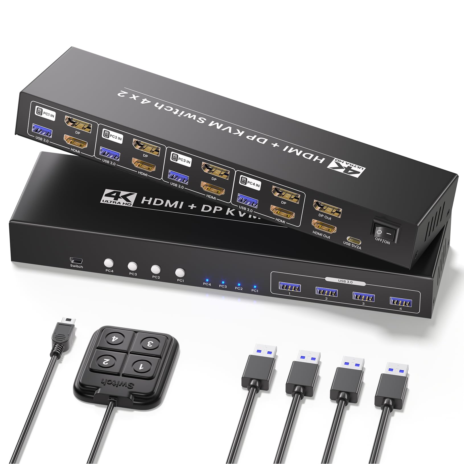 Conmutador KVM USB 3.0 de 4 puertos HDMI + Displayport, 2 monitores, 4 computadoras, 4K60Hz Dual Monitor HDMI DP KVM Switch para 4