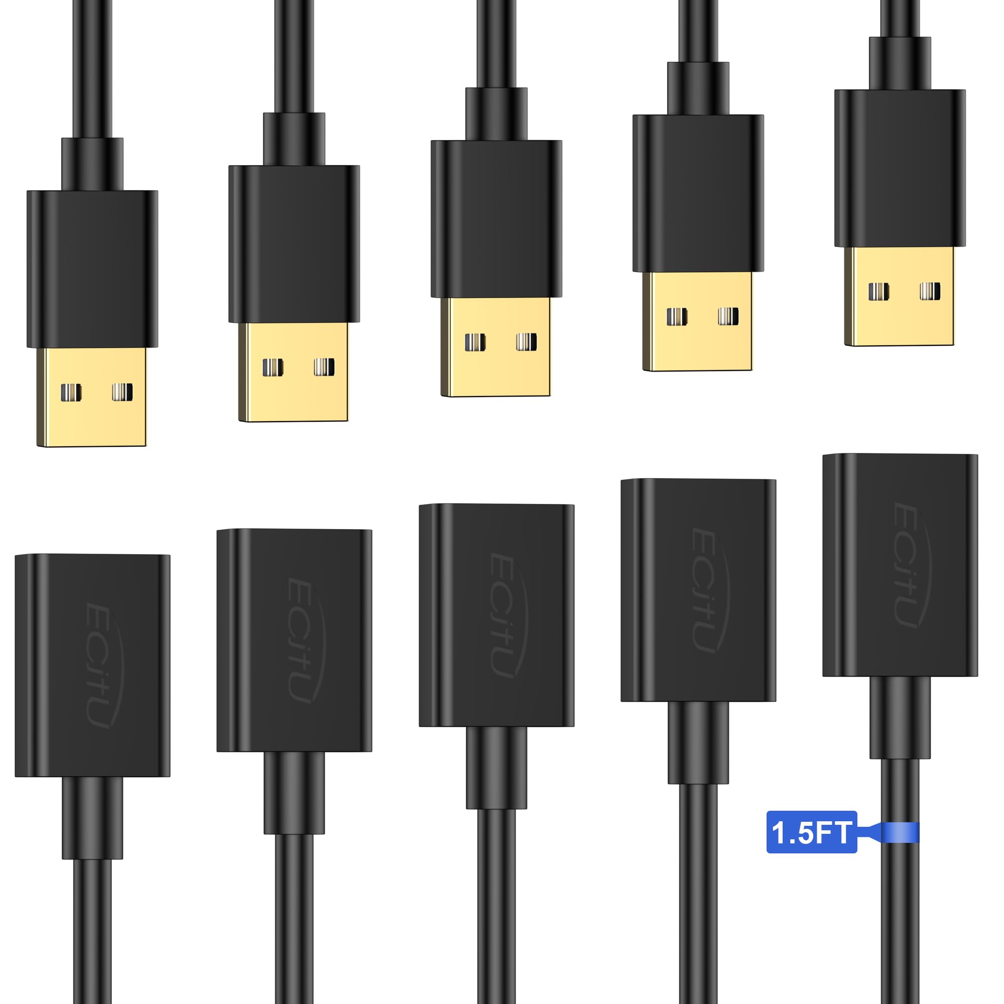 Cable extensor USB de 1.5 pies (paquete de 5), cable de extensión USB 2.0, USB A macho a hembra, compatible con unidad flash USB,