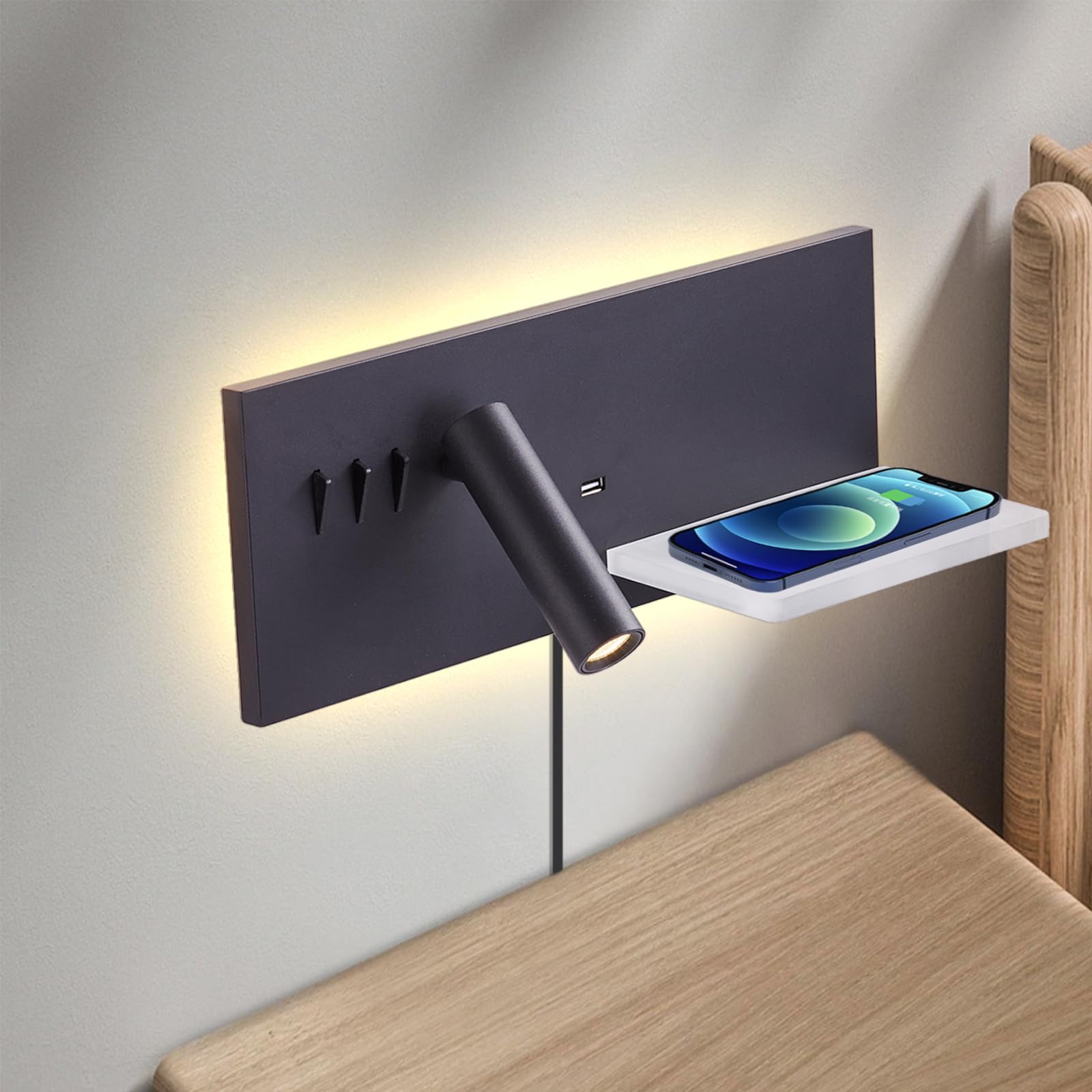 Luz de lectura LED montada en la pared con cargador inalámbrico y puerto USB, luz de pared para leer en la cama, lámpara de cabece
