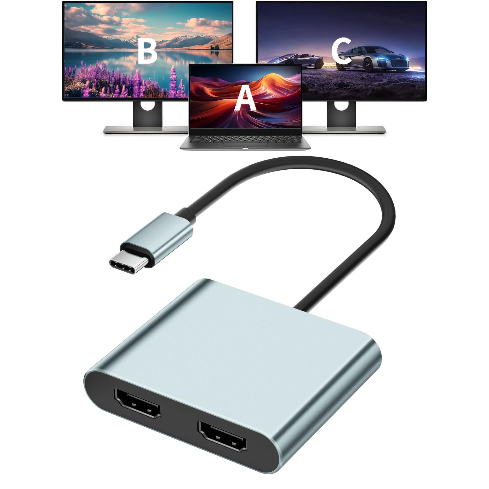 Adaptador USB C a HDMI dual, divisor de 4K a 60Hz tipo C a HDMI para monitores duales Extend Display para MacBook Pro/Air, Dell XP
