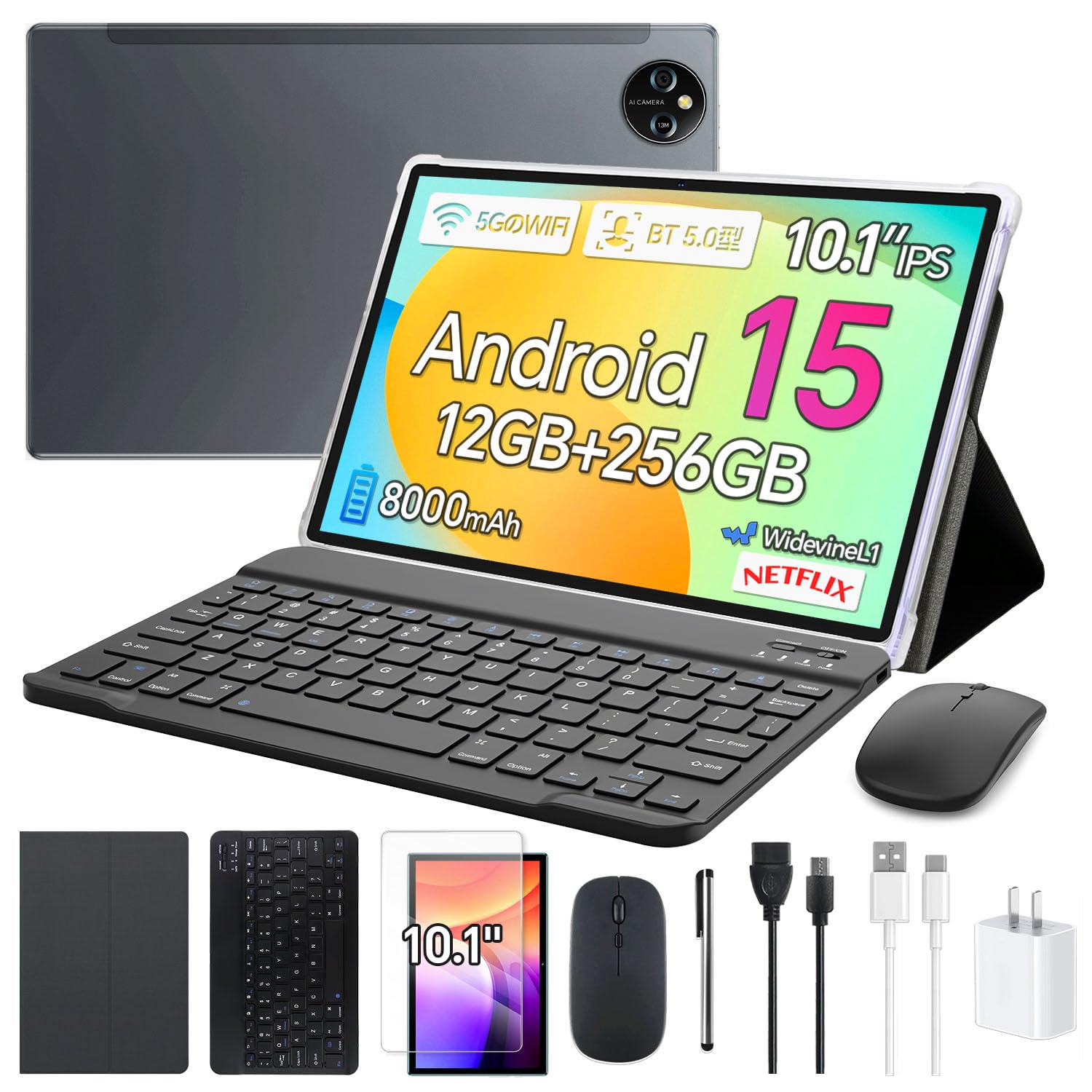 Tablet Android 15 de 10.1 pulgadas con teclado, Octa-Core, 12 GB de RAM 256 GB de almacenamiento 1 TB expandible, cámaras duales d