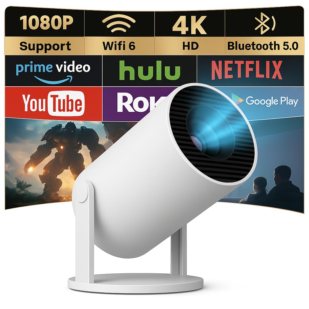 Proyector inteligente para el hogar con WiFi6 y Bluetooth 5.4, mini proyector portátil 4K 1080P, proyector pequeño inteligente gir
