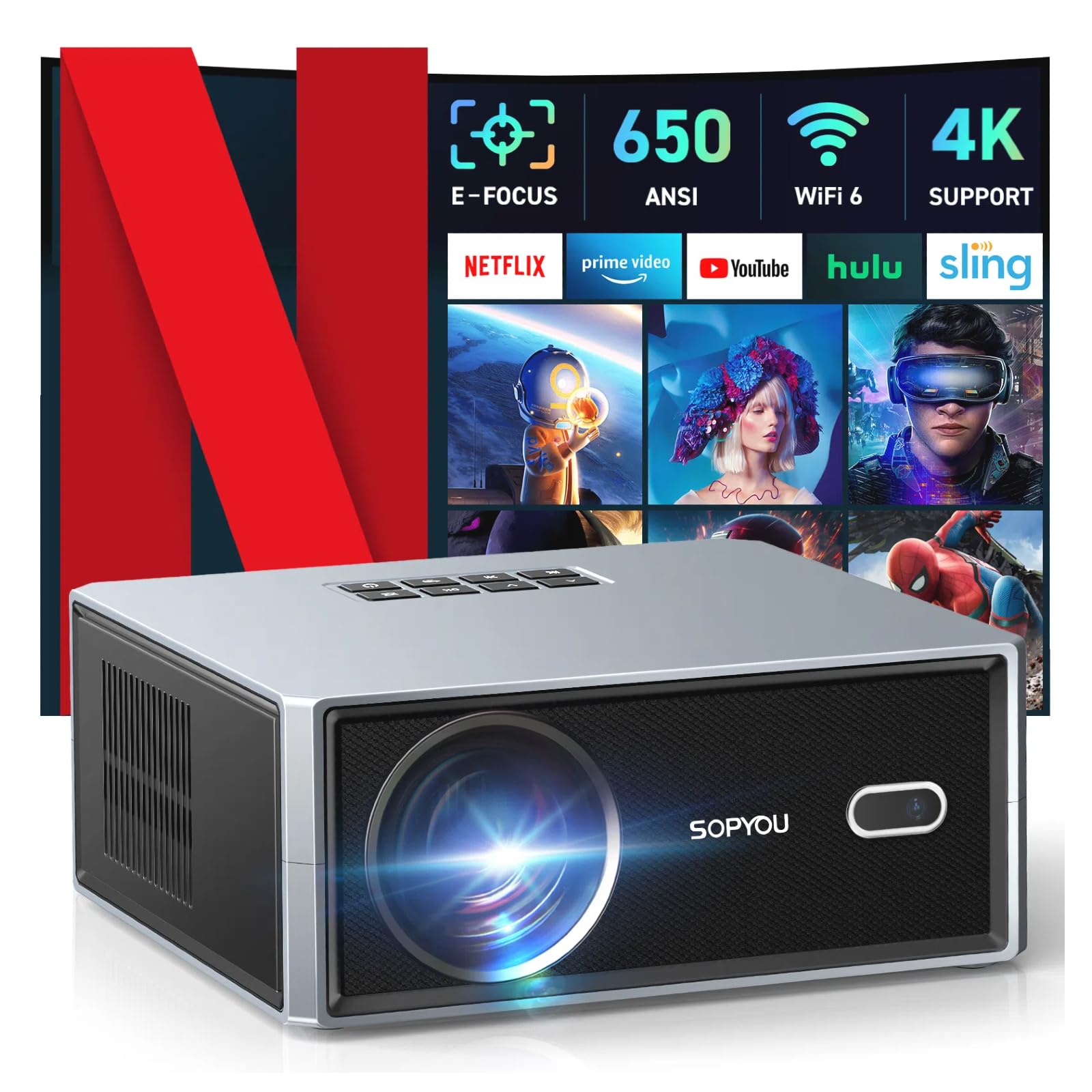 Proyector inteligente con licencia de Netflix con WiFi y Bluetooth, proyector de películas para exteriores SOPYOU 4K con aplicacio