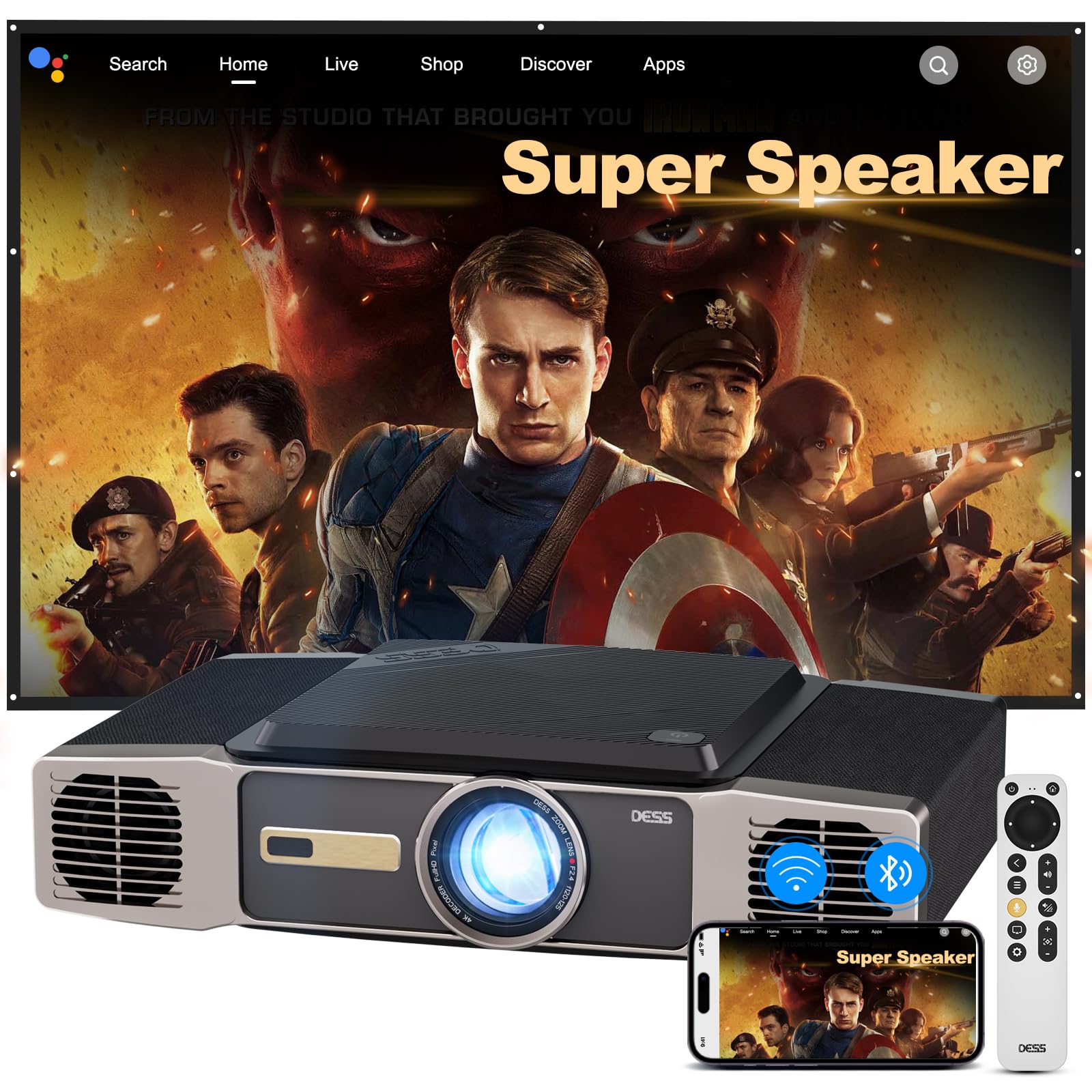 [60W Big Stereo Sound & 2500 Brightness]Dess Projector With WiFi And Bluetooth,Hometheater projector With Electric Stand,Auto Focu