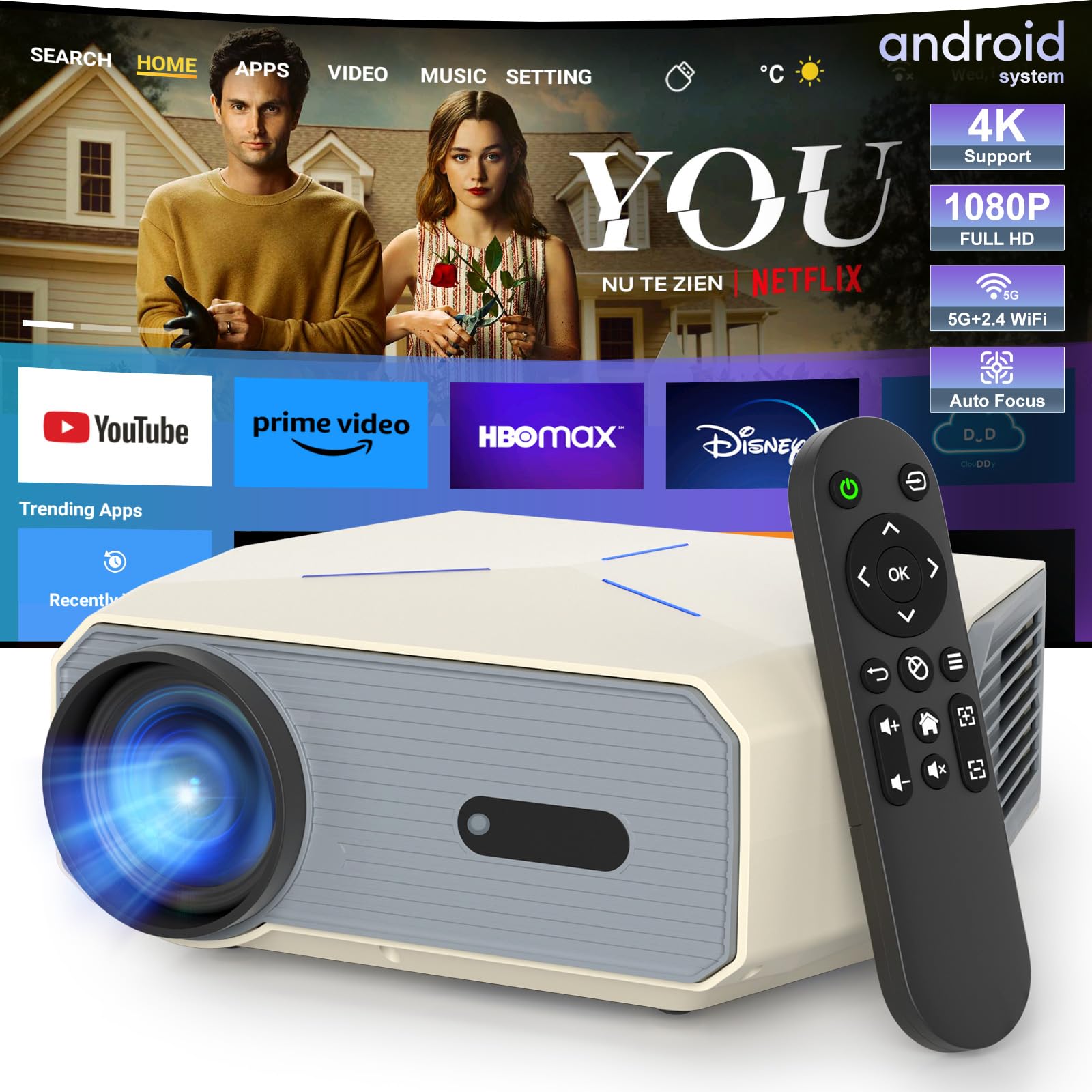 Proyector inteligente con WiFi y Bluetooth, proyector de película de soporte 4K, enfoque eléctrico Keystone automático de 360°, pr